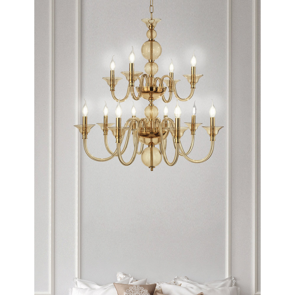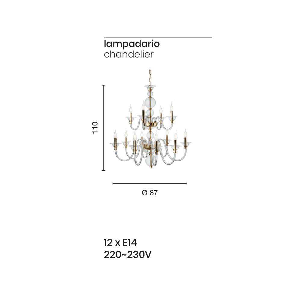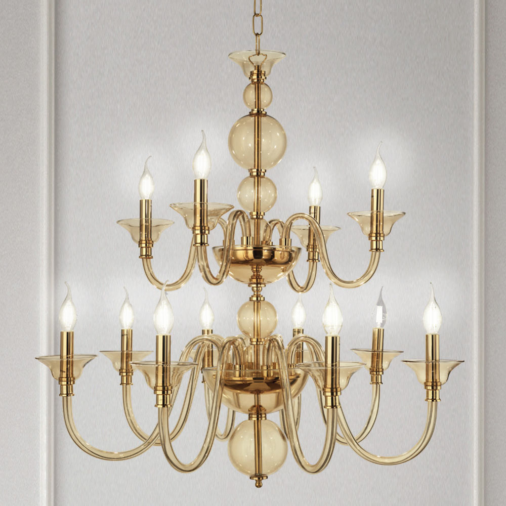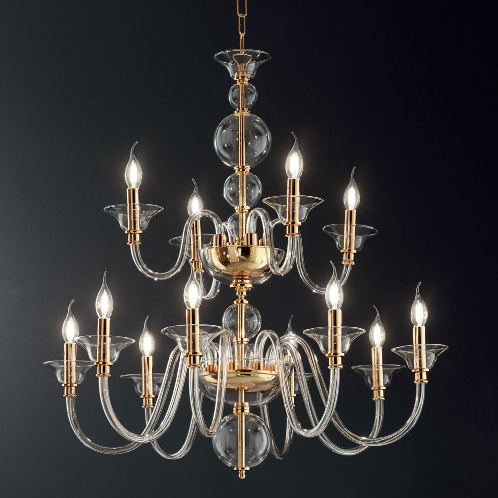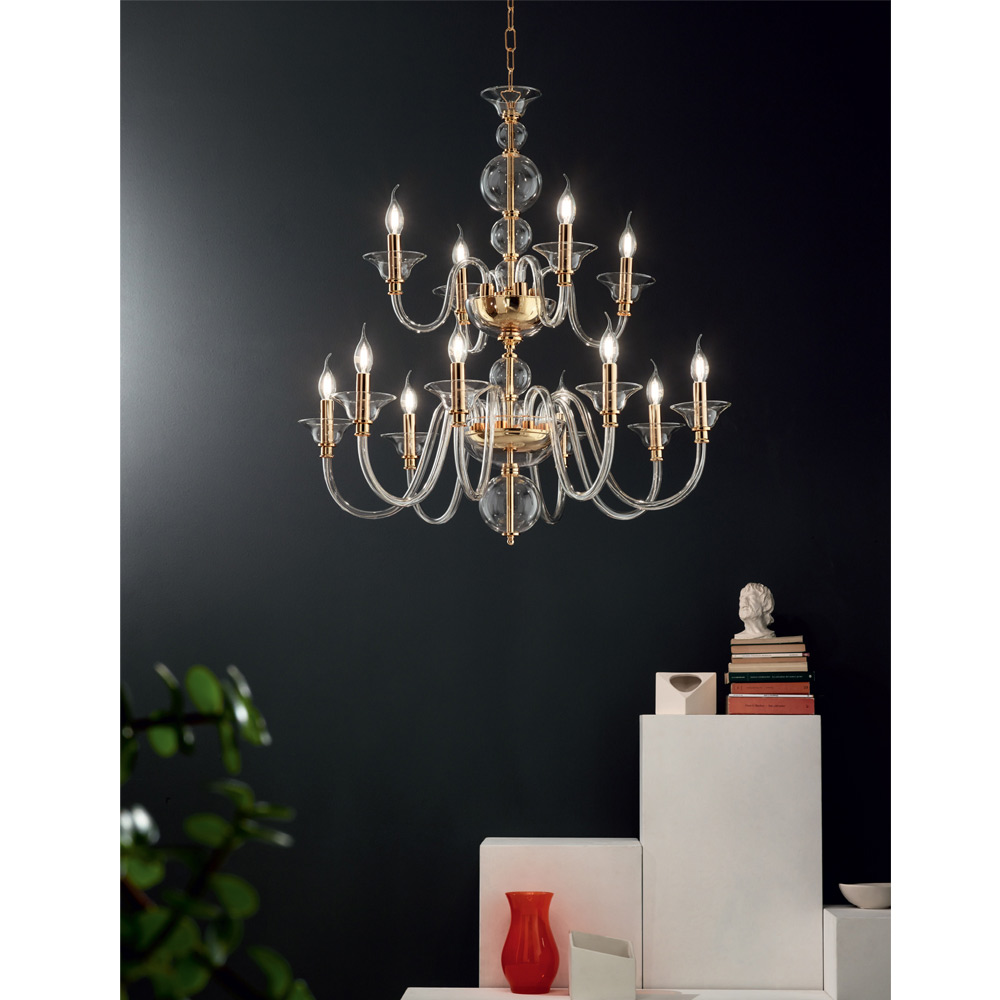 Klassisk 12-lys lysekrone i gyldent metal og håndlavet glas, luksus lavet i Italien.