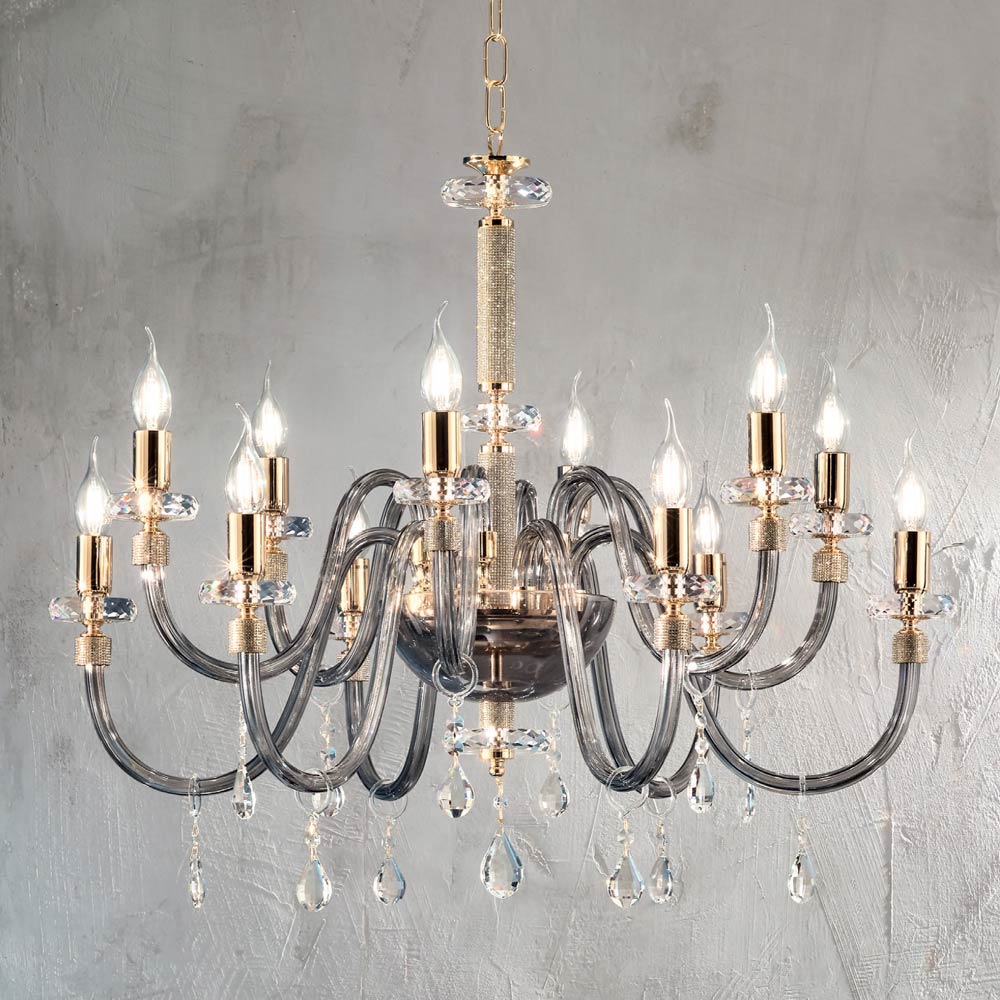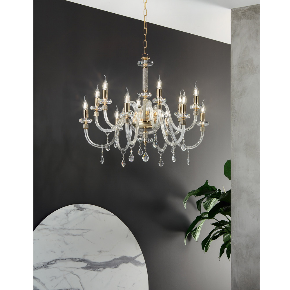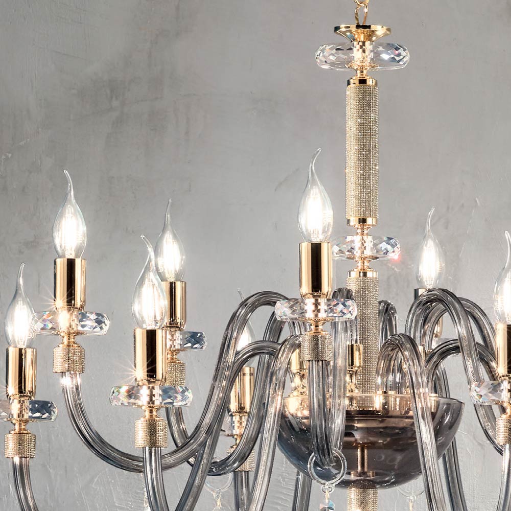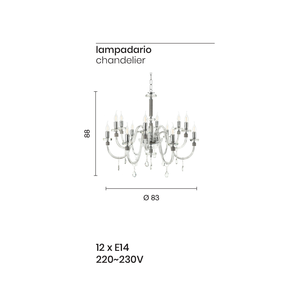 Denne vedhængslysekrone i klassisk stil består af 12 buede arme lavet af håndlavet glas i Italien med en "rigaton" effekt, hvis ende er omgivet af glitter i metallet, ligesom den centrale del af komplementet, hvor to cirkulære rør, de understøtter strukturen afbrudt med to cirkulære skiver i forskellige størrelser lavet af slebet krystal.