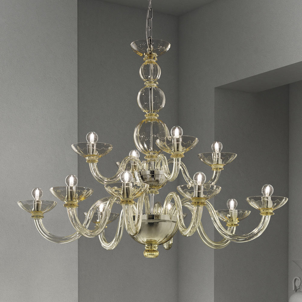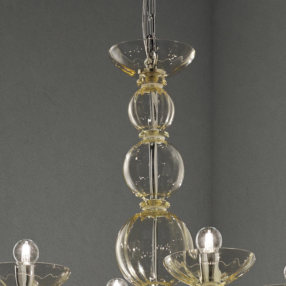 Lysekrone med 12 lys i Venedig-glas, håndbearbejdet topasfinish med detaljer i poleret forkromet metal . Et møbel med en fantastisk og ikonisk tilstedeværelse præget af en blød og sart linje og raffinerede kurver , der passer perfekt til klassiske miljøer men samtidig også til rum med en nutidig stil. Traditionselementet er præget af dets vidunderlige komponenter i helt håndlavet blæst glas, som er transformeret til at opdatere sig selv takket være trendy farver. Dens omsluttende former gør den til et ideelt element til at indtage ethvert miljø, både i hjemmet og kontrakt, med klasse og dynamik .