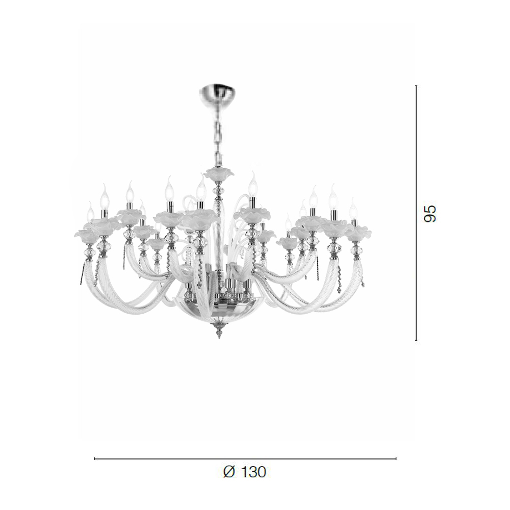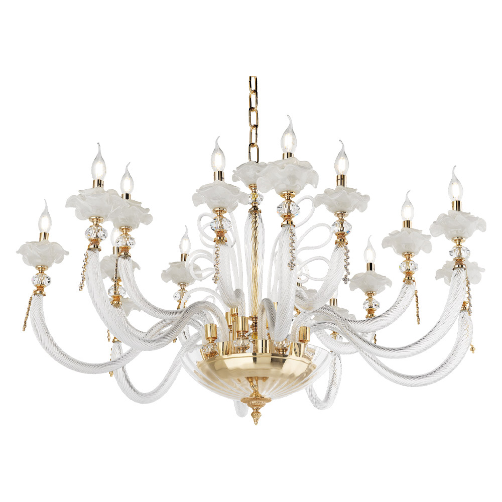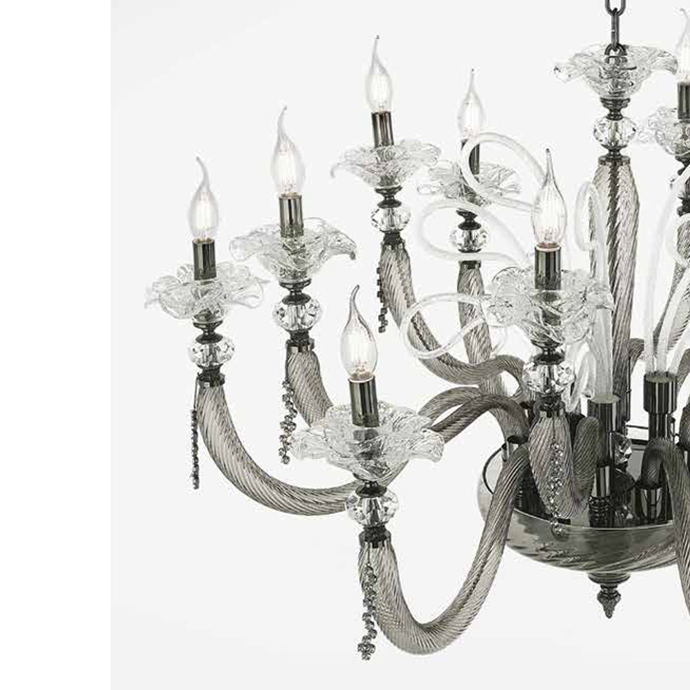 Håndlavet lysekrone med 16 lys i blæst glas og blomsterdekorationer, italiensk luksus.