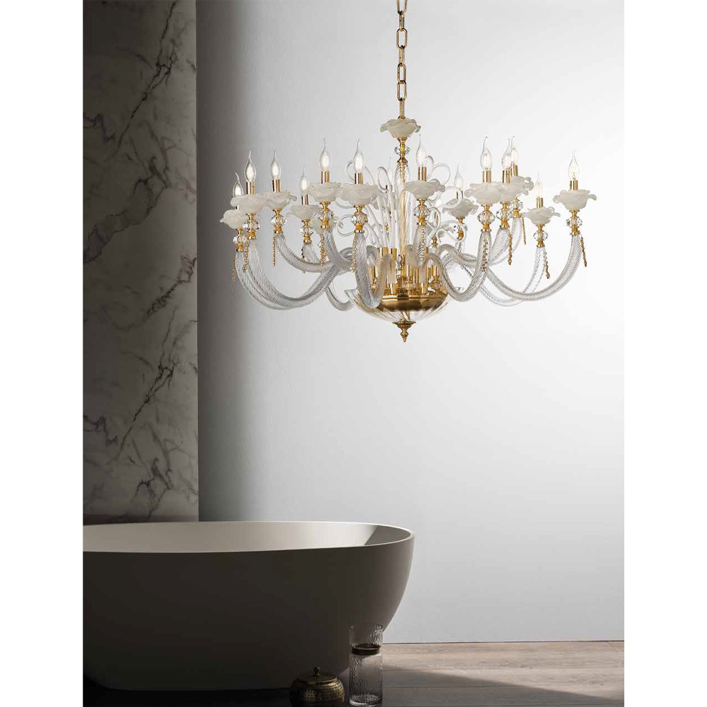 Tilgængelige finish:- Krop i gennemsigtigt glas - detaljer i mælkehvidt glas - skinnende guldmetal;