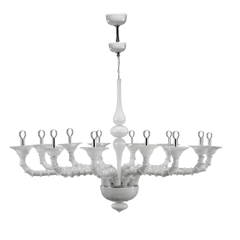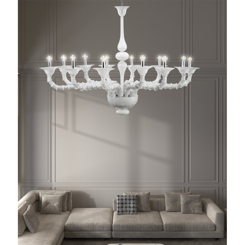 Et kunstværk kendetegnet ved en triumf af dyrebare detaljer lavet af håndblæst hvidt Rezzonico-glas designet til at fuldende store områder af huset såsom spisestuer eller stuer, hvilket giver liv til højkvalitetsbelysning med en spændende personlighed. Længden af armene er muliggjort takket være den særlige teknik defineret som "bossole", som består i at montere flere glasdele sammen, hvilket beviser godt håndværk .