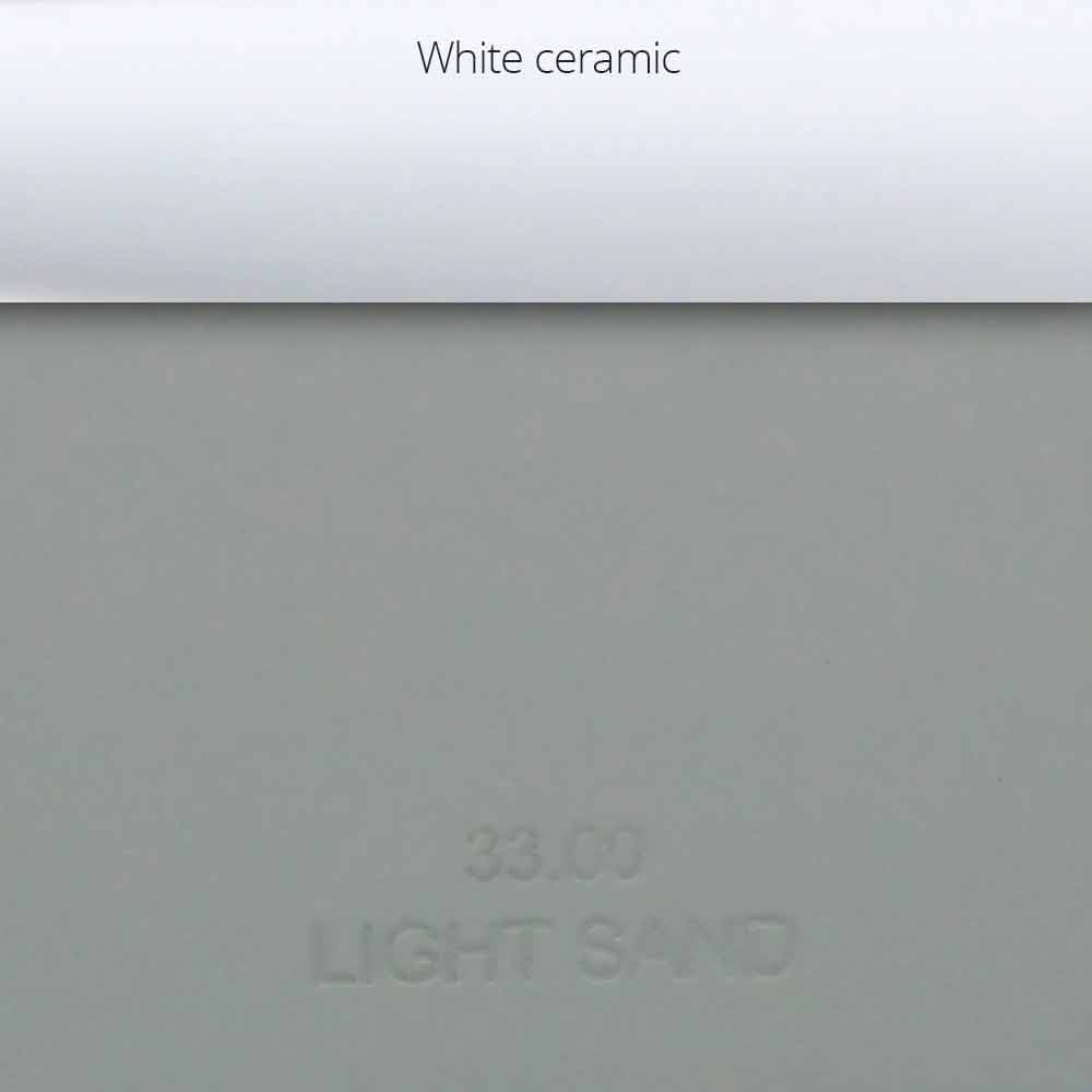 - Lys sand: mat varm lysegrå finish med hvide keramiske indsatser på håndtagene;