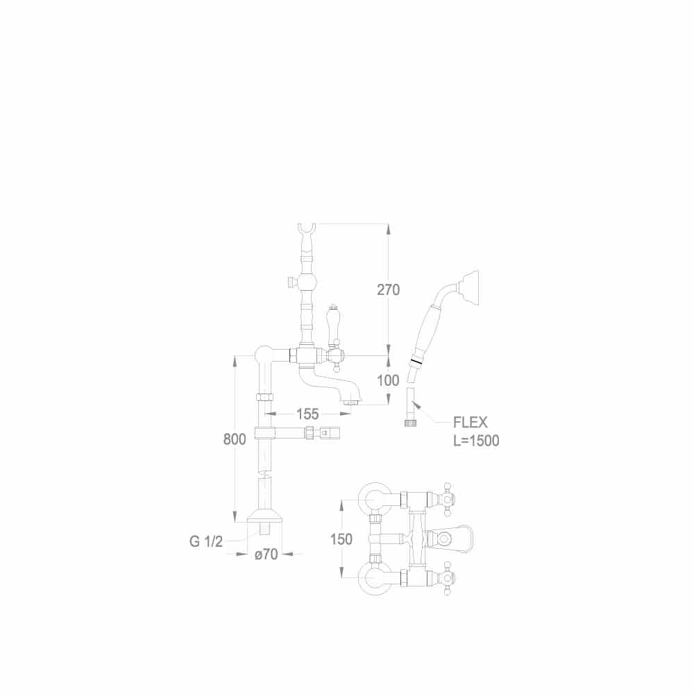 Udsat badekararmatur på søjler med omskifter og duplex håndbruser Fremstillet i Italien.