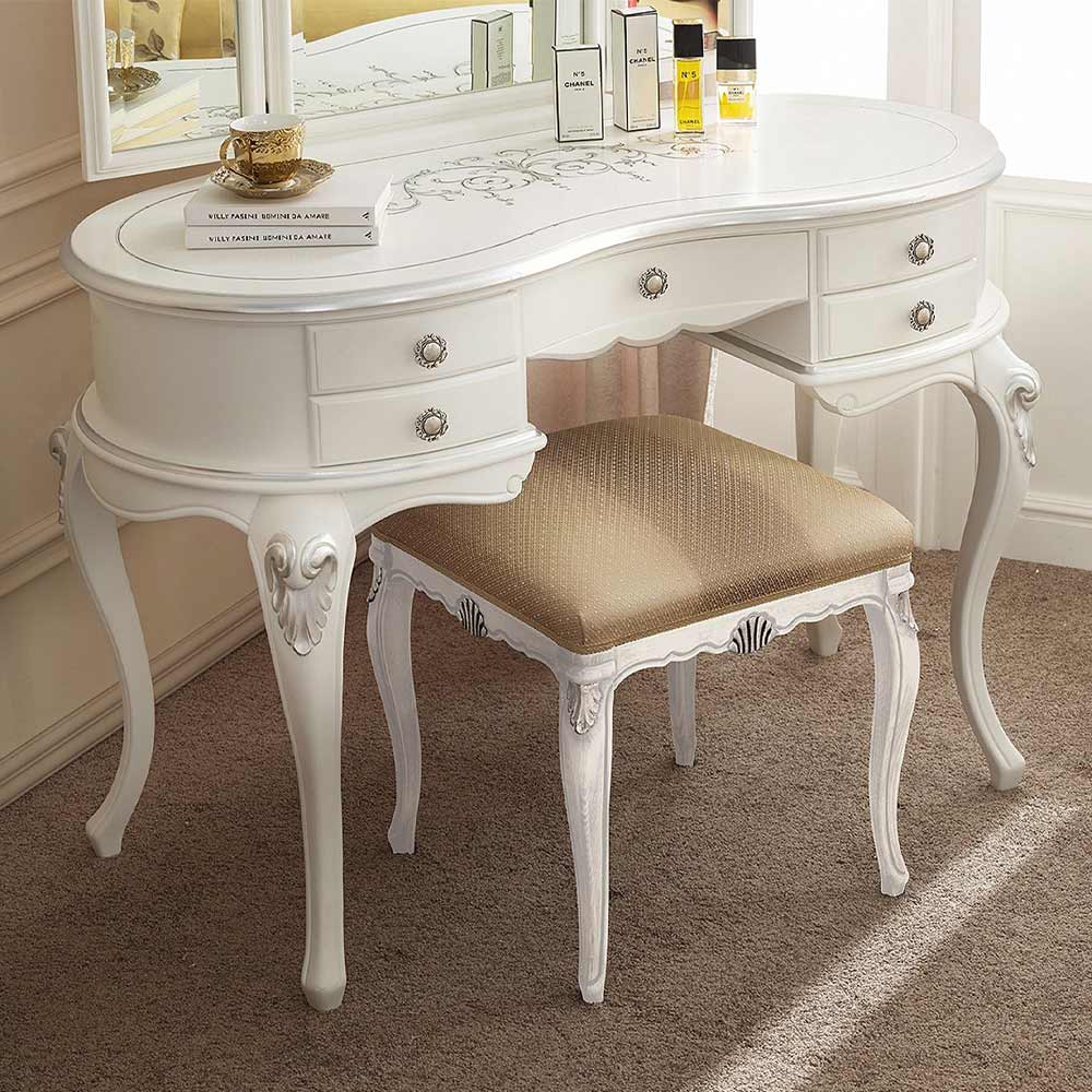 Klassisk make- up kam med 5 skuffer og formet spejl. Fremstillet af træ og fås i Bassano valnød og antik guldfinish med indlæg eller hvide træ- og sølvdetaljer. Et unikt og raffineret supplement, fuldstændig