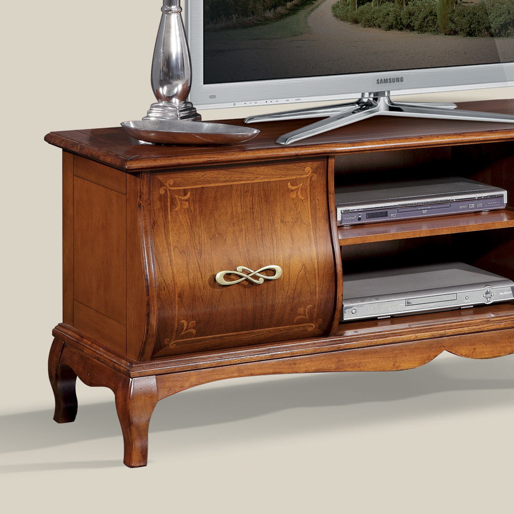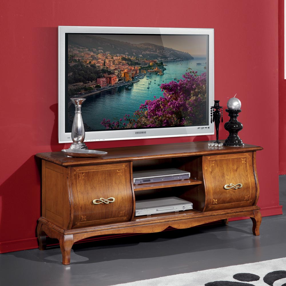 Klassisk TV-bord til stuen fremstillet af valnød med indlæg , komplet med to døre og praktiske opbevaringsrum. Unikt og raffineret, det er udelukkende fremstillet i Italien af dygtige håndværkere , færdiggjort med dygtighed og elegance. Produktionen udføres med materialer af høj kvalitet , og håndværket udføres i hånden med den største omhu og professionalisme, der kendetegner Made in Italy -produkter.
