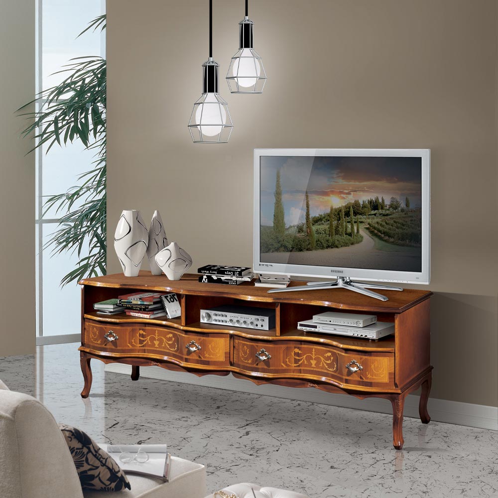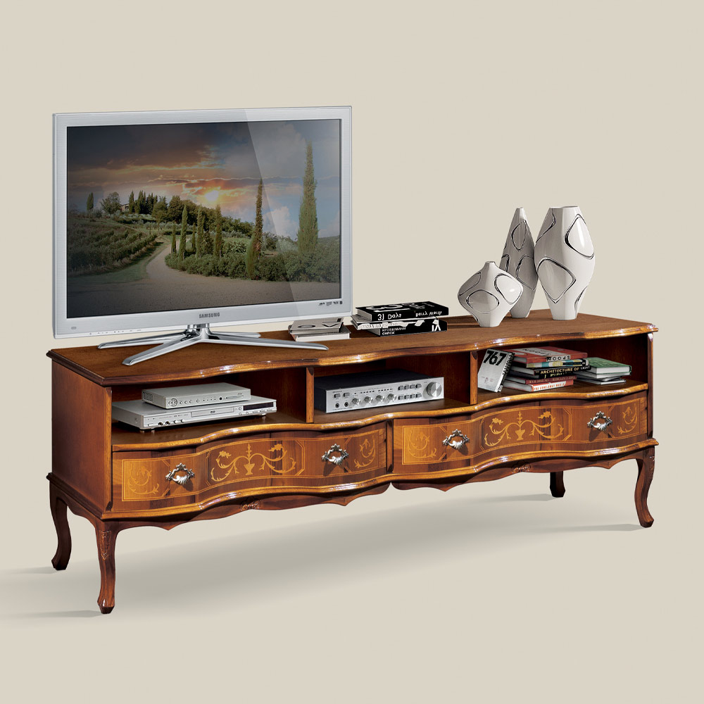 Klassisk tv-bord i træ med rum og skuffer, fremstillet i Italien.