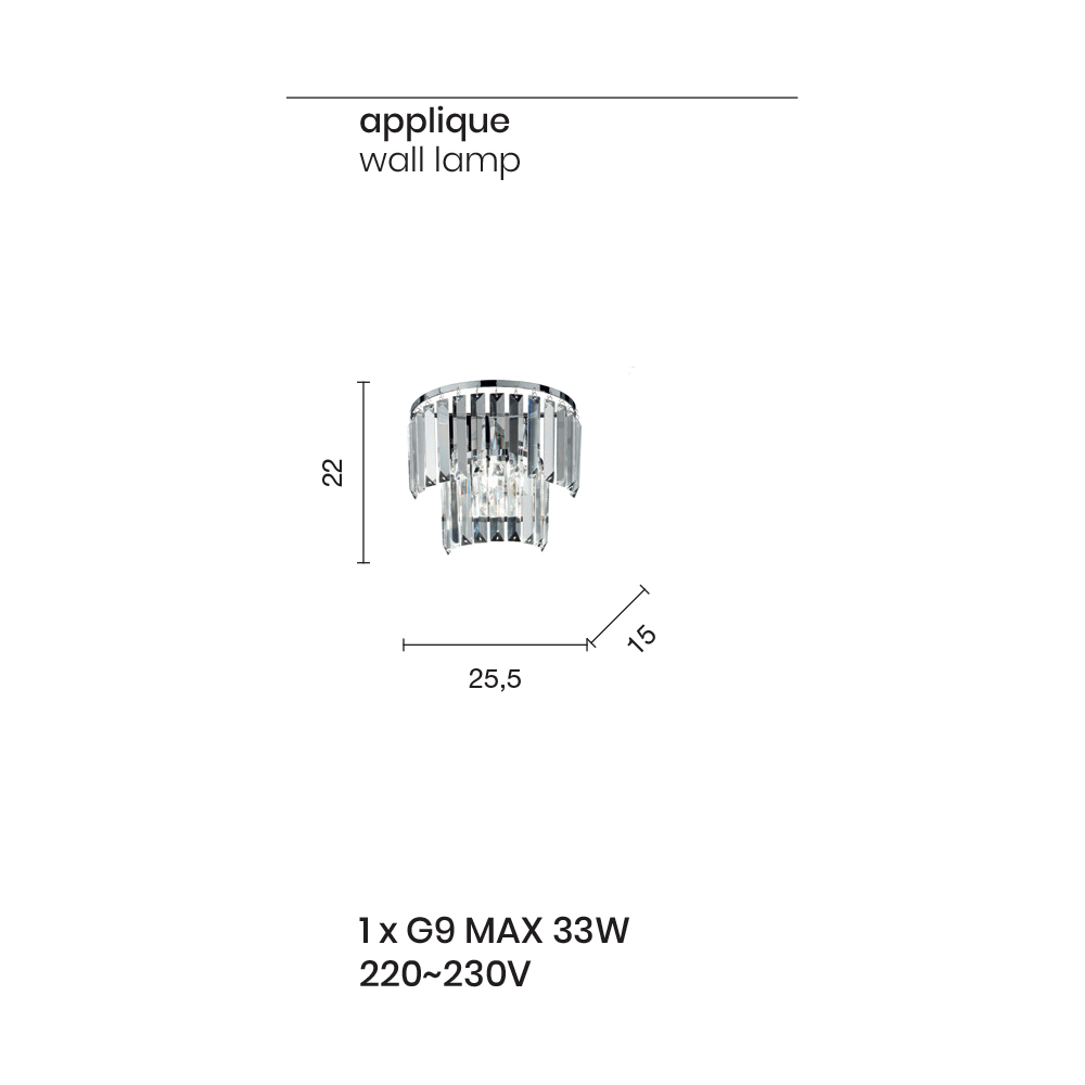 Den består af en sølvmetalstruktur , og dens stærke side er givet af krystalvedhængene , der dekorerer , oplyser ethvert miljø med smag og karakter, i en blanding af stil, klasse og innovation.