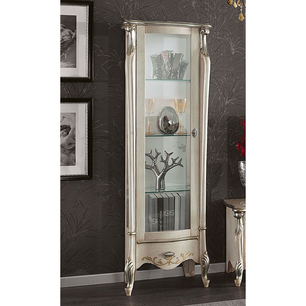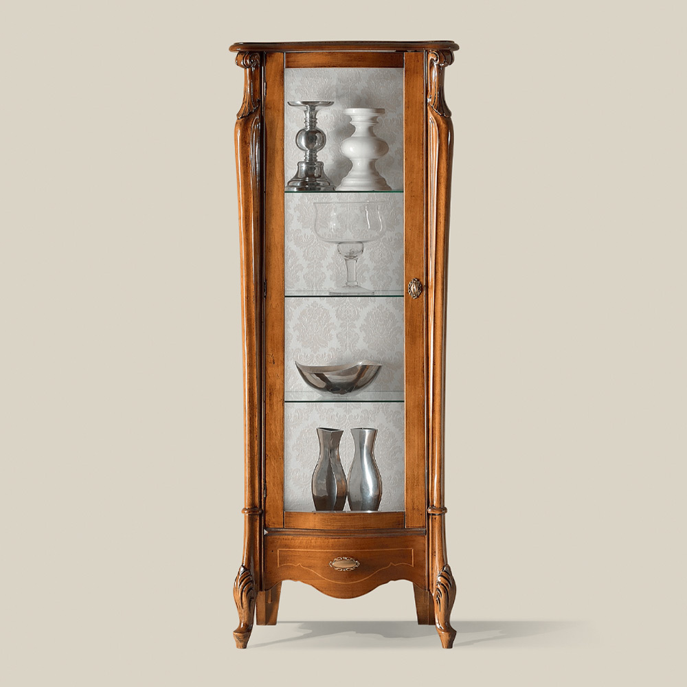 udstillingsvindue i klassisk stil er perfekt til at dekorere en stue med stil og elegance. Den er lavet af træ i Bassano valnød eller antik hvid finish, og har en låge og en praktisk skuffe. Det er også muligt at vælge mellem versionen med lågen, der kan åbnes til højre eller venstre.