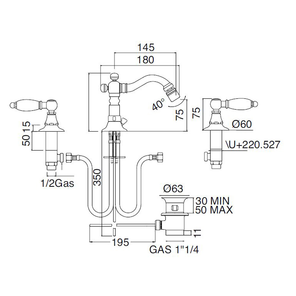 Bidet 3-huls vandhane med greb klassisk messingstil, kvalitetshåndværk fremstillet i Italien.