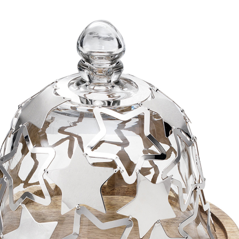 Denne kageholder har et sofistikeret og elegant klokke design , helt lavet med træbund og glaslåg med stjerneformet sølvmetaldekorationer.