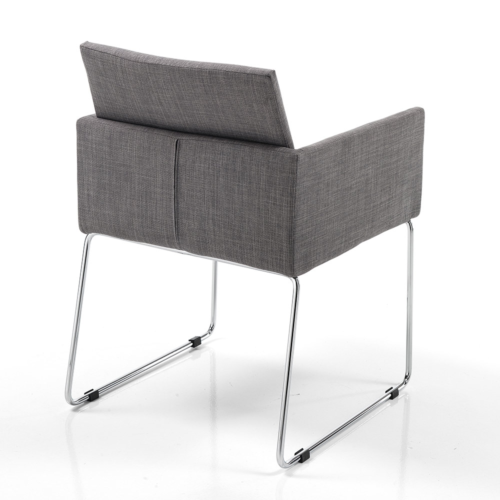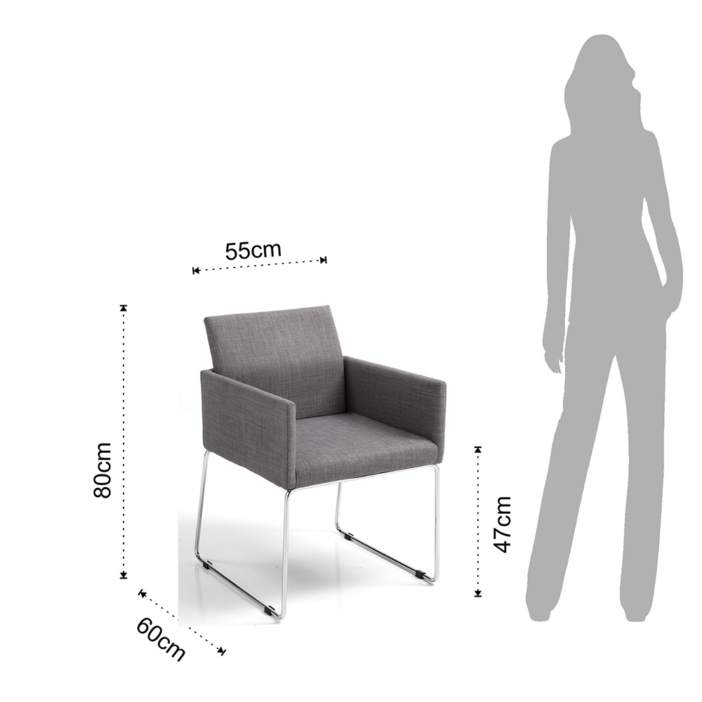 Køkkenstol med stel af forkromet metal og sæde helt betrukket med gråt stof udstyret med praktiske og komfortable armlæn . Ideel til at placeres i spisestuen og køkkenet, men også i et arbejdsværelse eller på kontoret takket være det elegante og raffinerede design og dets alsidige brug. Formerne, der markerer figuren, giver et særligt indbydende og behageligt sæde for at sikre vidunderlige øjeblikke dedikeret til afslapning.