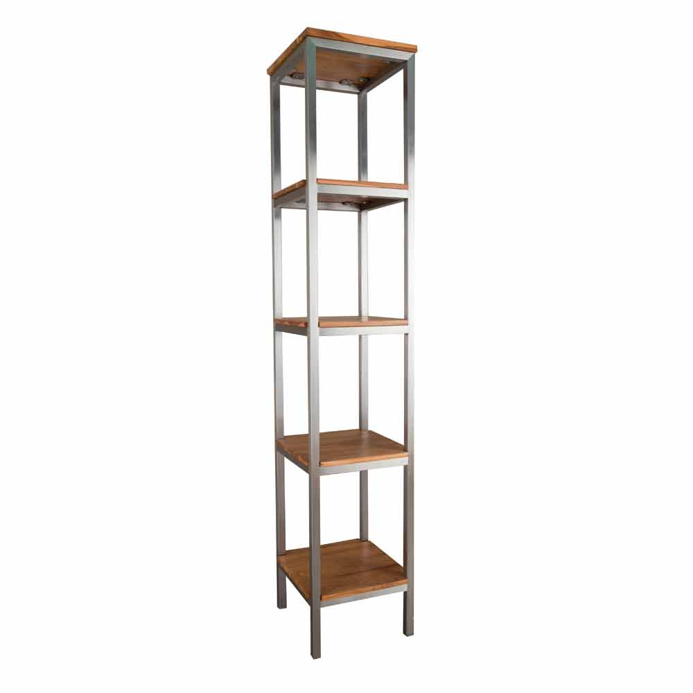 Enkel og konkret struktur i satin rustfrit stål med 4 åbne hylder med toppe i naturligt teaktræ præpareret og vokset for bedre modstandsdygtighed over for slid og gnidning. Perfekt på badeværelset, elegant i stuen. Leveres samlet, skridsikre gummipuder.