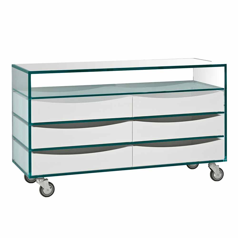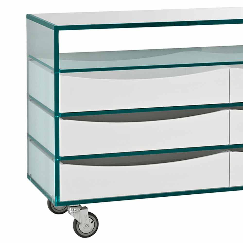 Kommode i moderne stil på hjul i extraclear glas med seks skuffer i hvidt træ, realiseret i Italien for hånd.