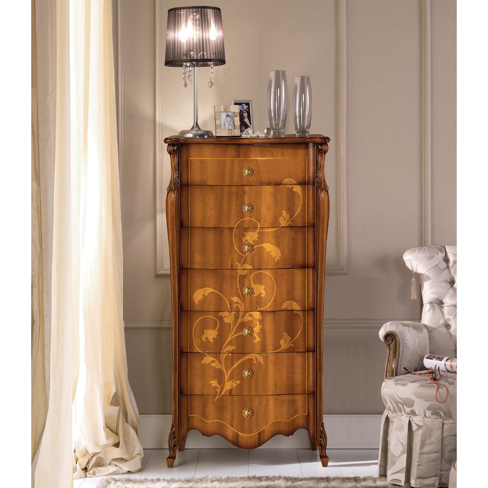 7-skuffers kommode i indlagt valnøddetræ Fremstillet i Italien.