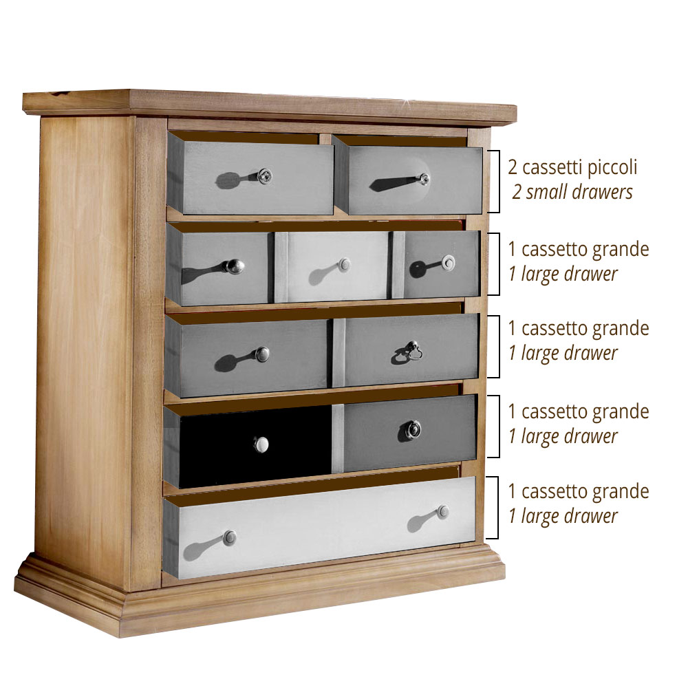 Skuffernes design er rent æstetisk. Startende fra toppen er der 2 små skuffer efterfulgt af 4 store. Kontakt os for et tilbud eller for information ved at bruge formularen "