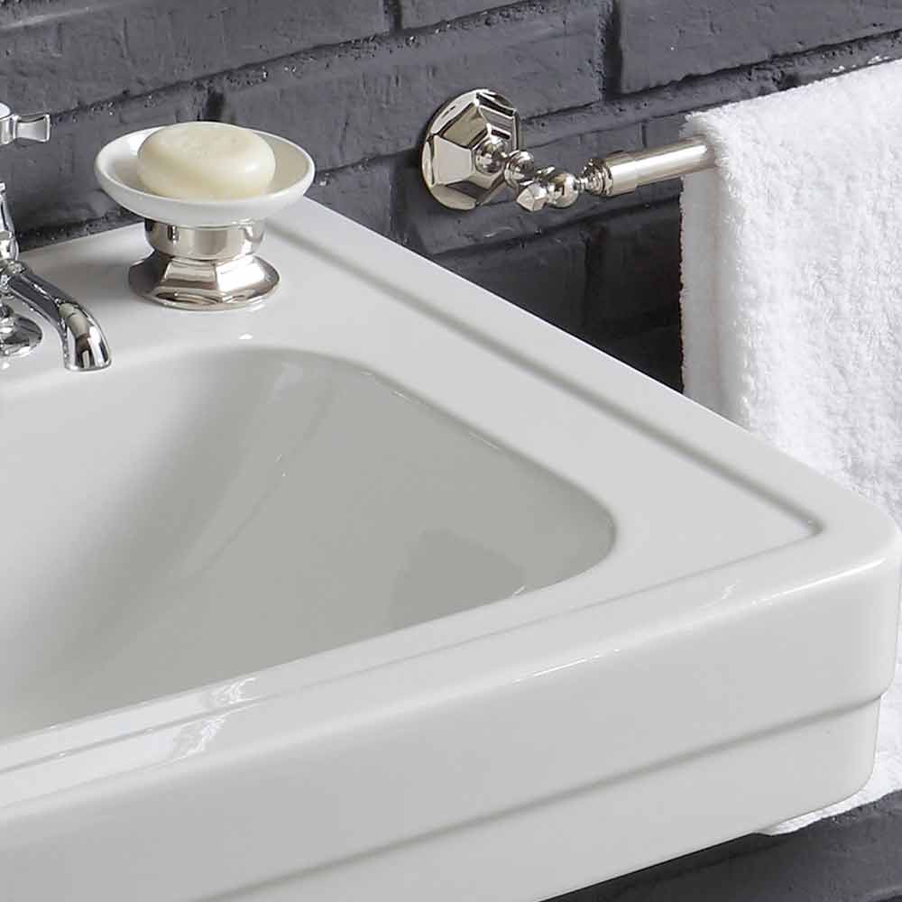 Line er også afsluttet og beriget med tilstedeværelsen af en smuk og elegant keramisk fritstående sæbeskål med forkromede detaljer og en vægmonteret tandbørsteholder i samme design, alt sammen komplet med en elegant forkromet håndklædestang i messing.
