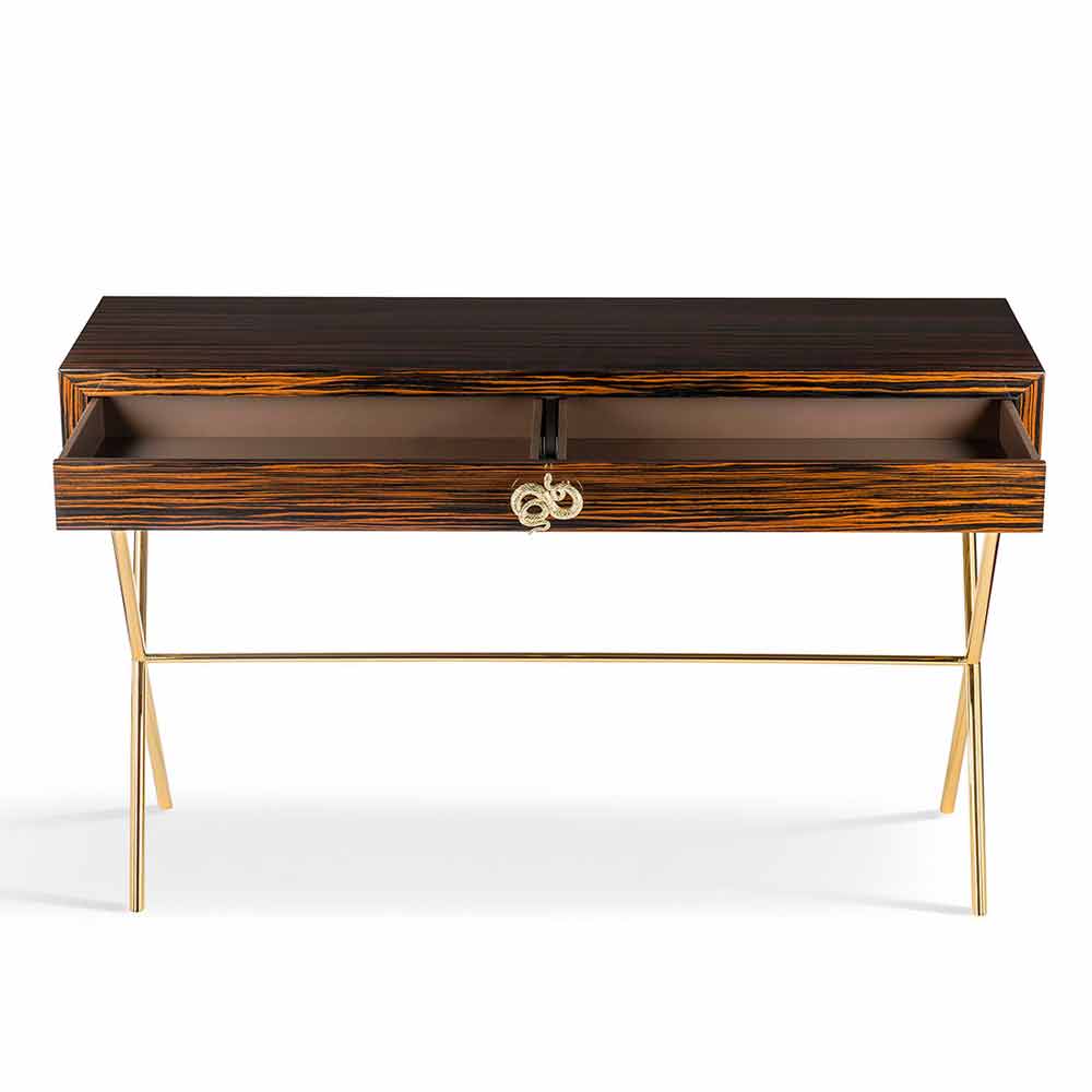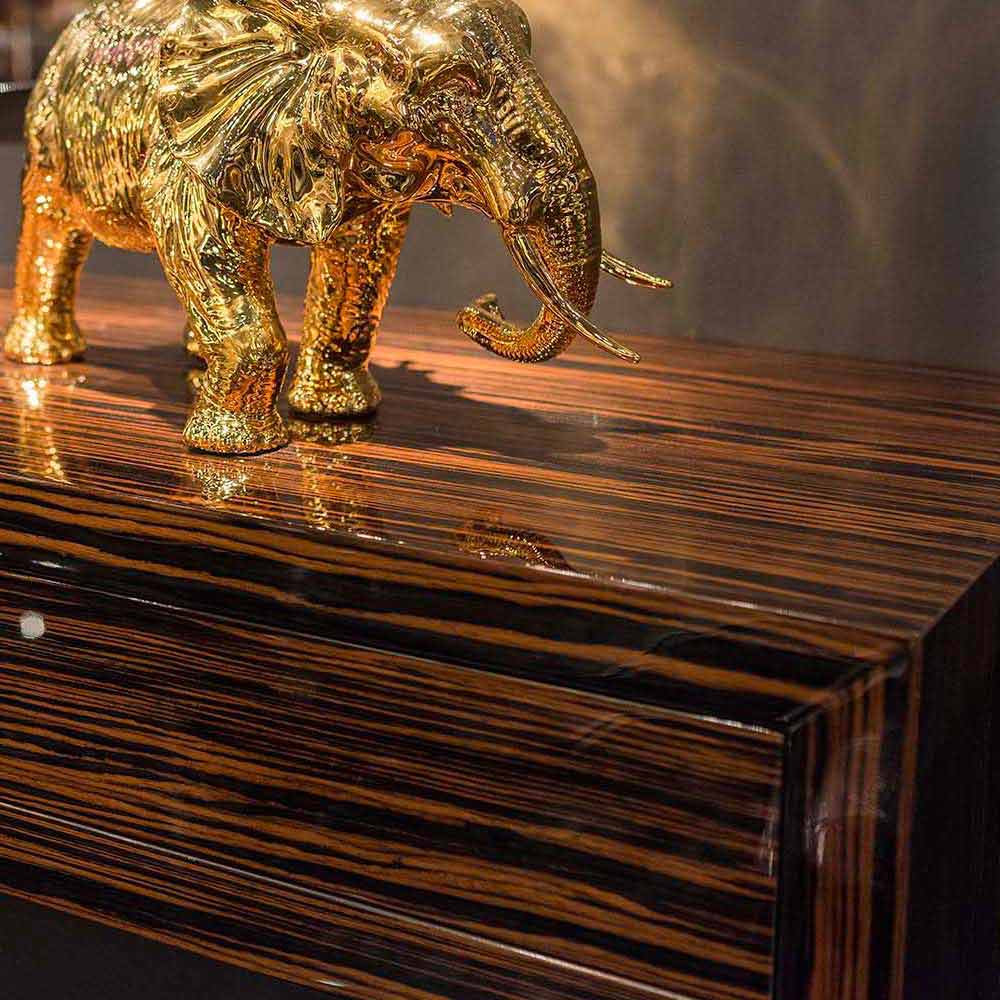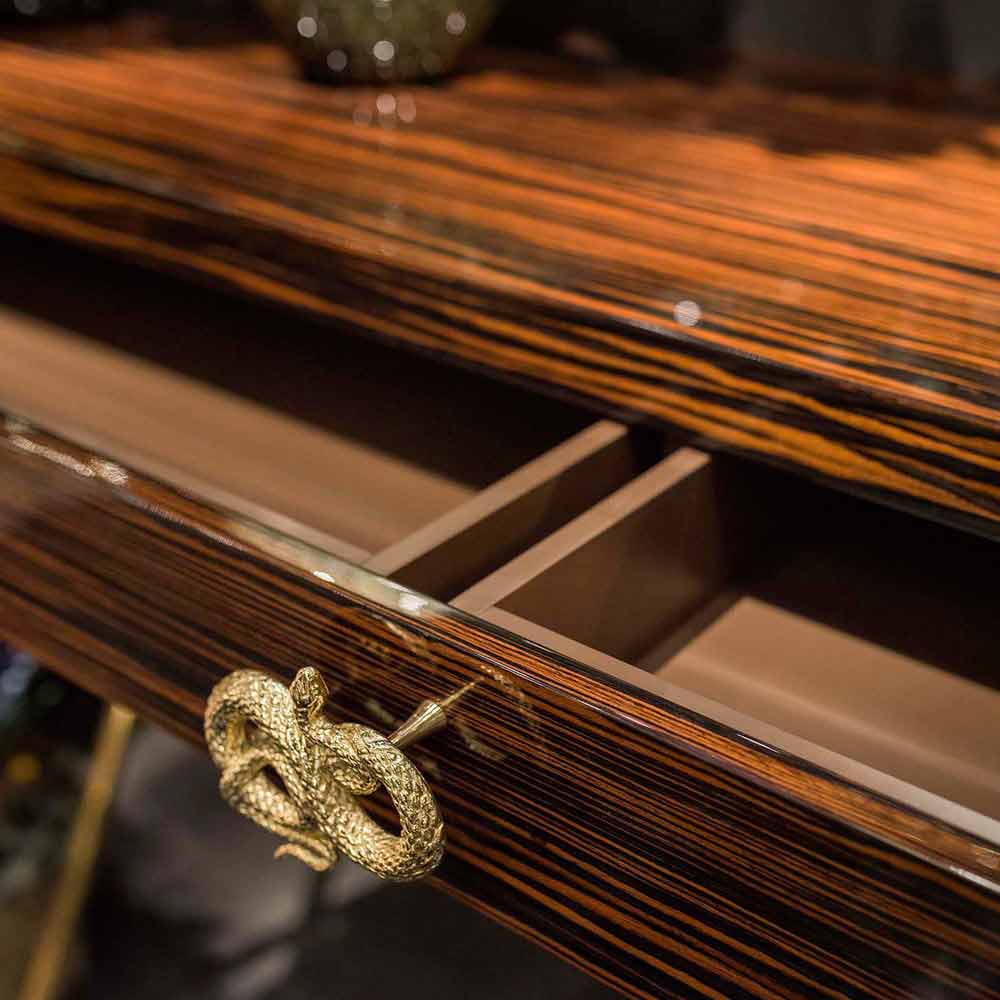 Lavet af ægte poleret ibenholt træ eller hvid perle, 45 ° junction, to forskydelige skuffer inde for Salice guider med slow motion. Front med støbt messing håndtag. Base galvaniseret poleret 24 kt forgyldt metal.