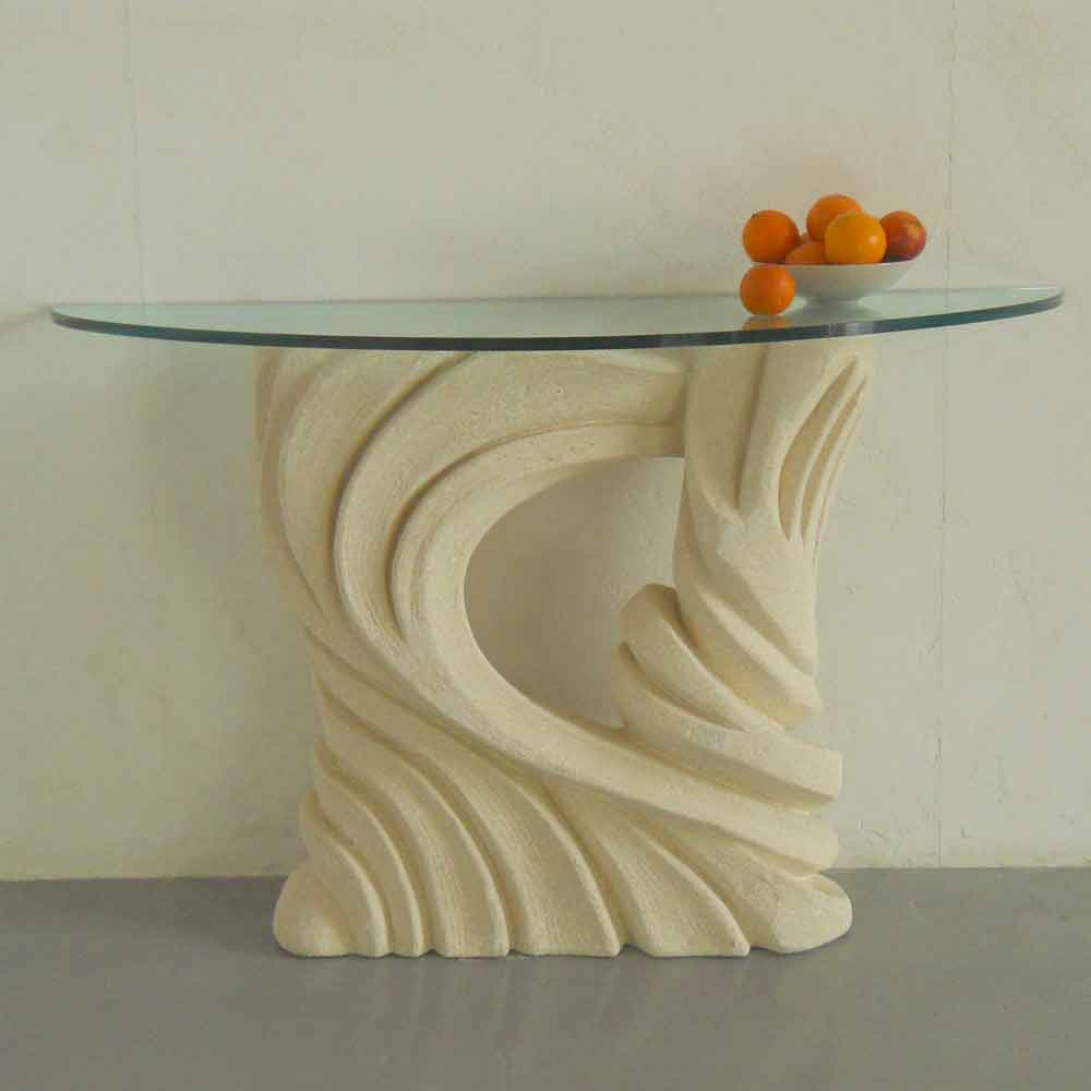 Konsolbord Made in Italy med base i naturlig Vicenza sten, skåret manuelt fra den faste blok og med 15 cm tyk floatglasplade, formet elliptisk, hvilende på bunden.