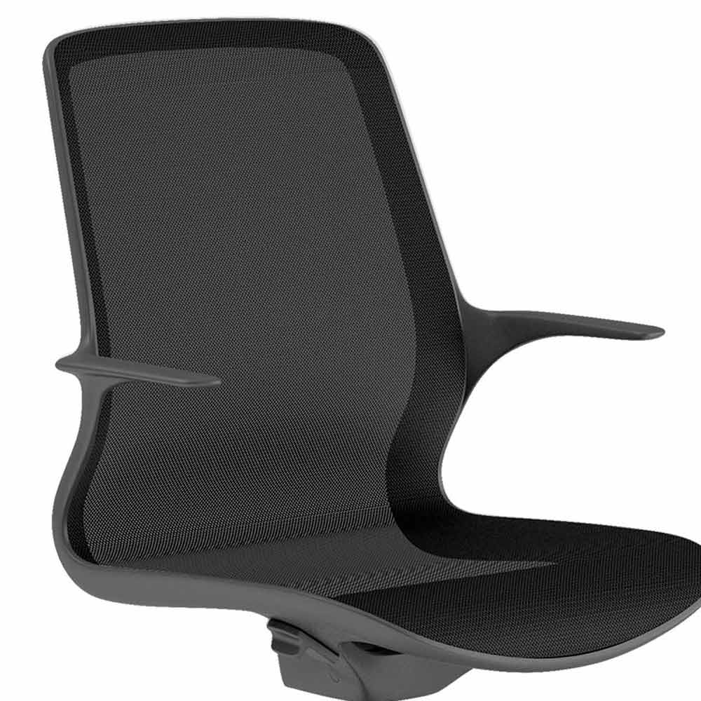 svingbart sæde med gasløft , sort nylonstruktur med sorte polyurethanhjul, dækket af sort mesh og udstyret med faste armlæn.