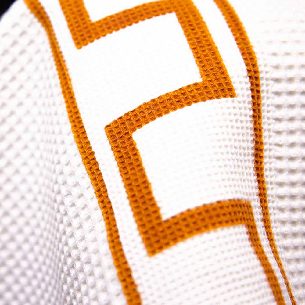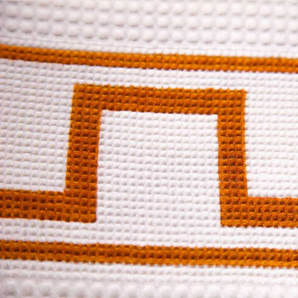 Badehåndklæde i ren hvid honningkat bomuld med rustfarvet pompeisk græsk tryk håndlavet, håndlavet skabelse lavet i Italien unikt stykke.