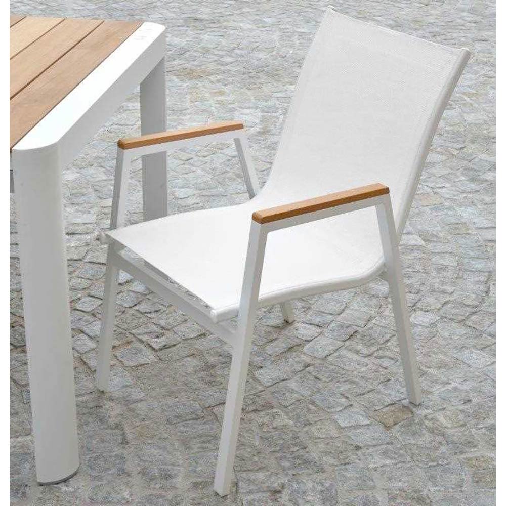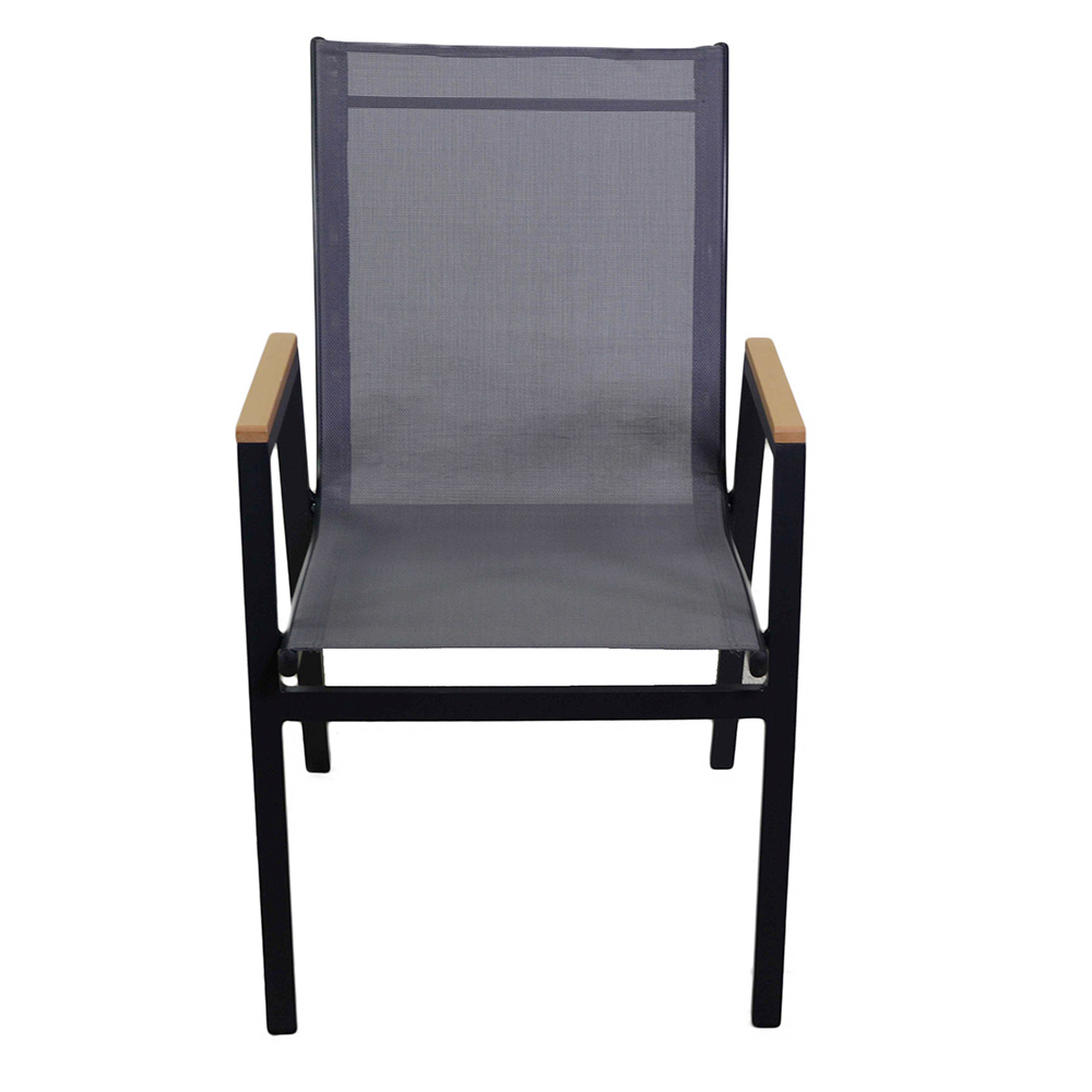 Denne pulverlakerede aluminiumsstel lænestol kombinerer stil og funktionalitet, perfekt til at fuldende ethvert moderne udendørs rum. Stoffet textilene sikrer modstandsdygtighed over for elementerne og langvarig komfort, mens træindsatserne på armlænene tilføjer et strejf af varme og elegance.