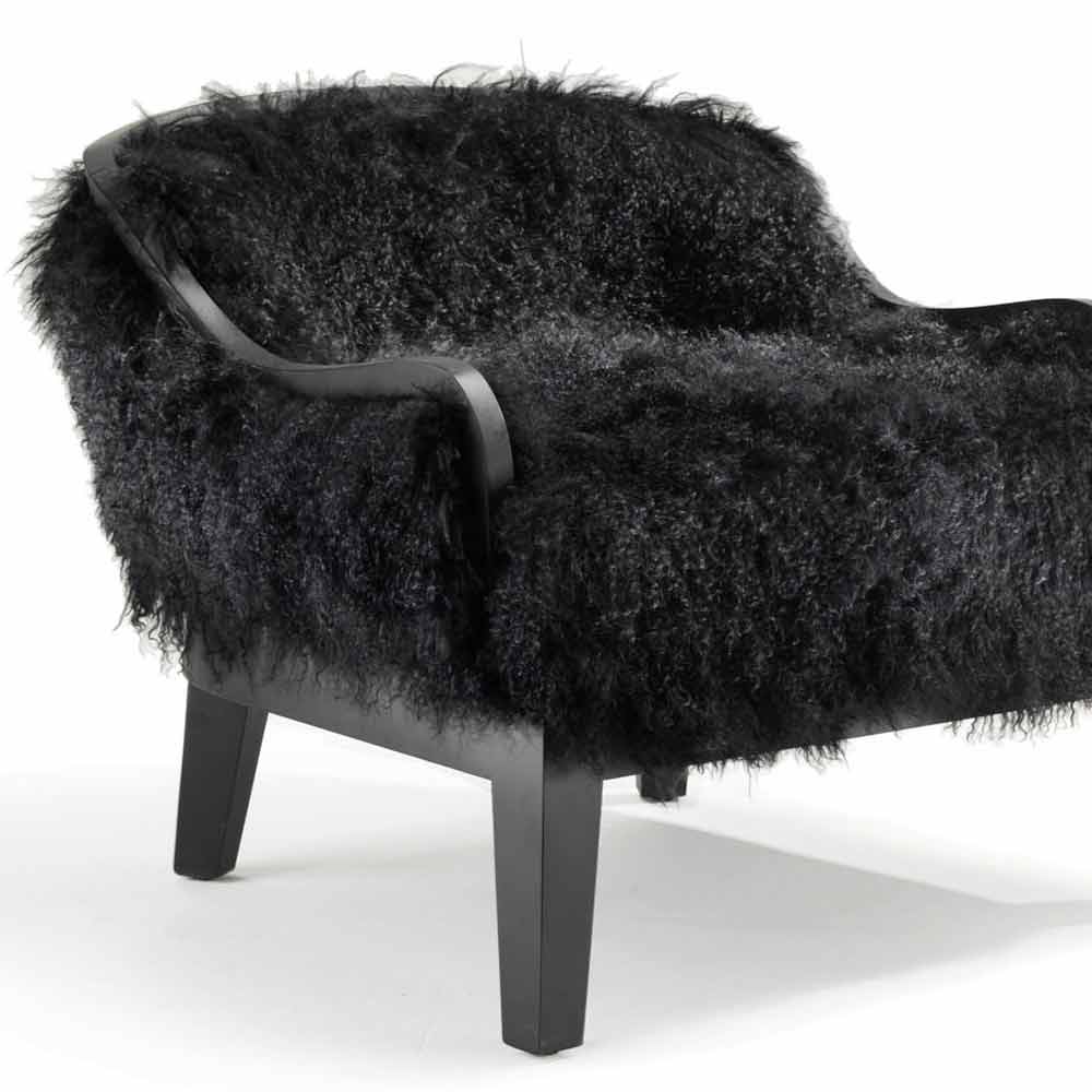 Lav lænestol. Retro læder polstret ryglæn. Forreste sæde og ryg betrukket med sort tibet lam pels. Ramme og træ base. Færdig i sort eg.