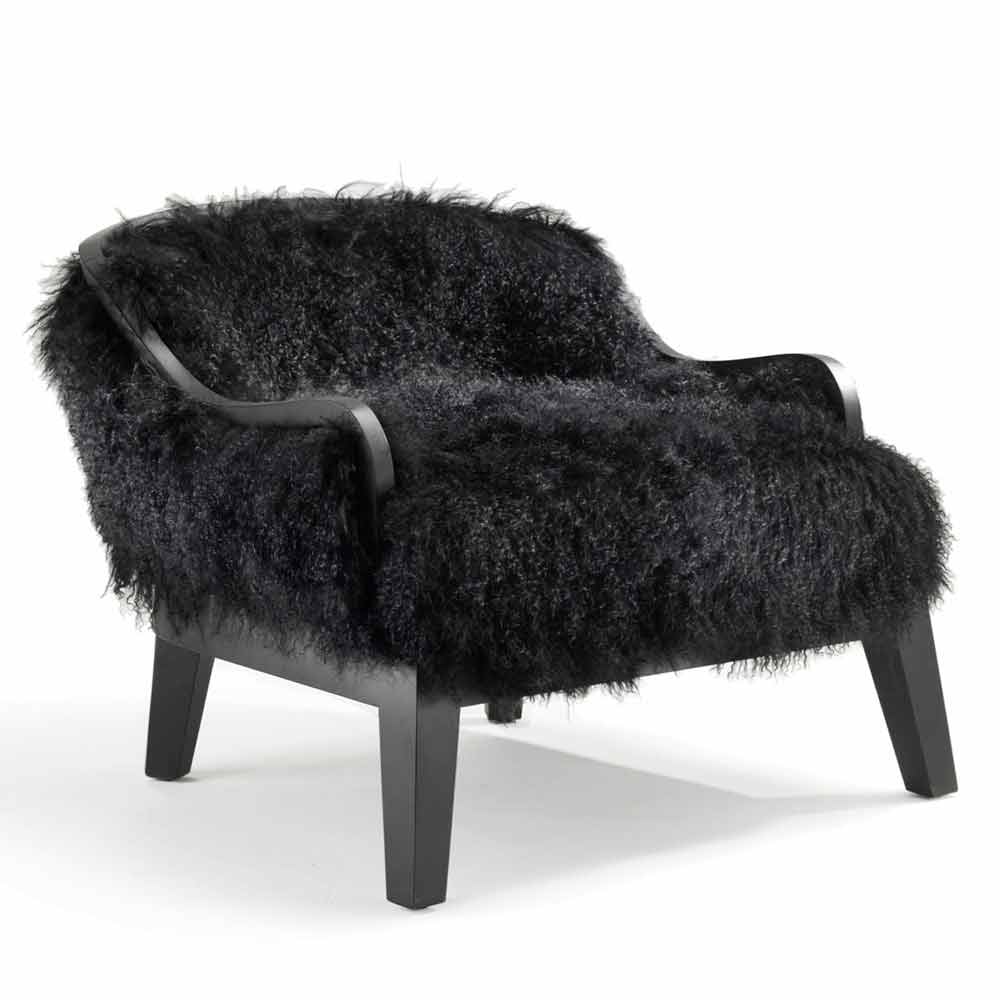 Lænestol med lav siddepladser i sort læder og pels, lavet i Italien, Eli