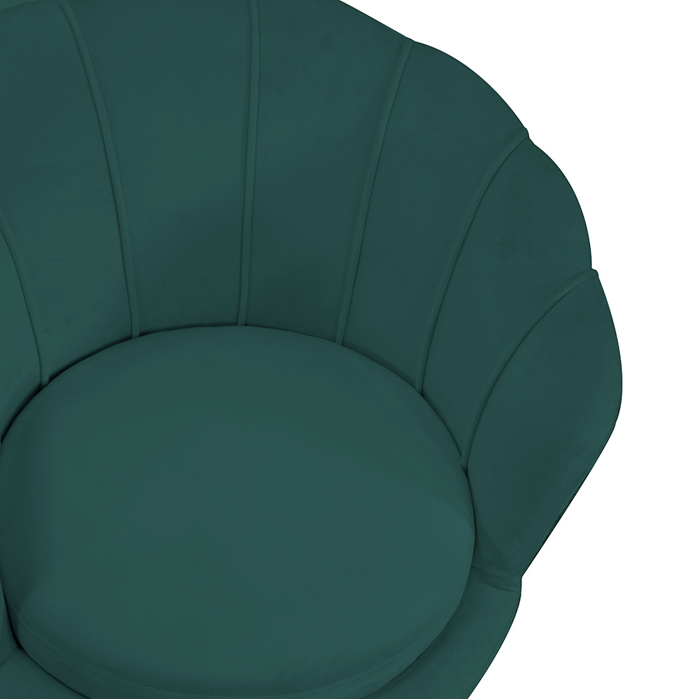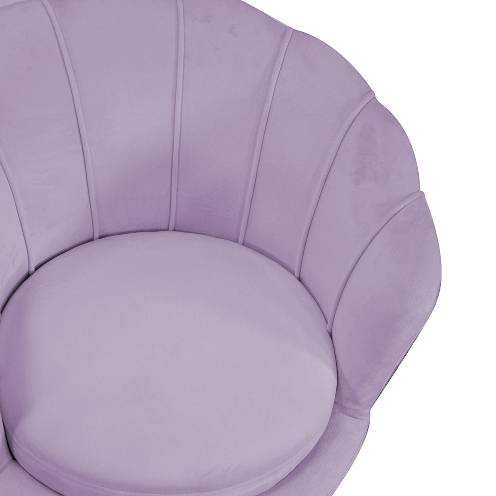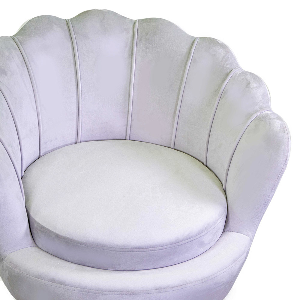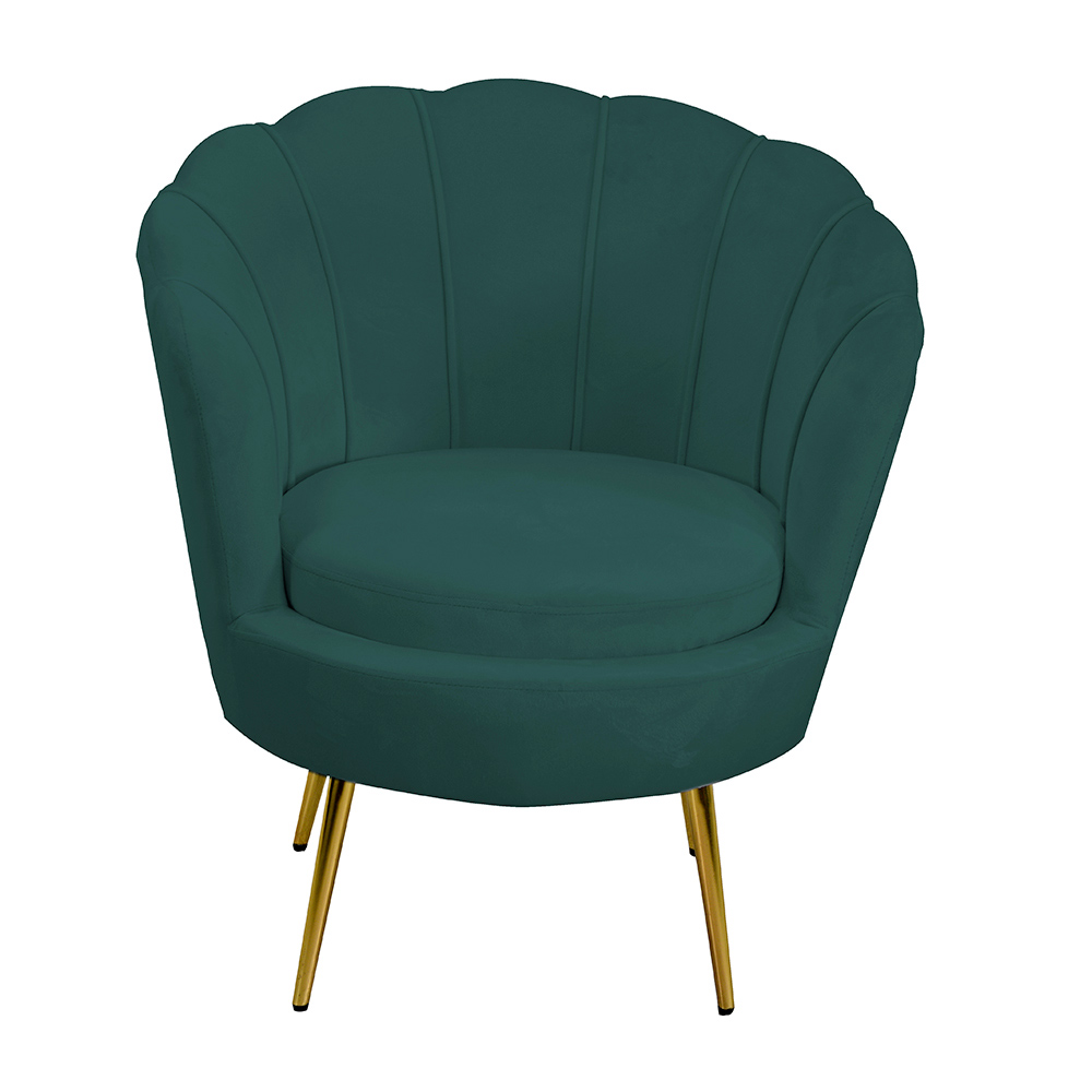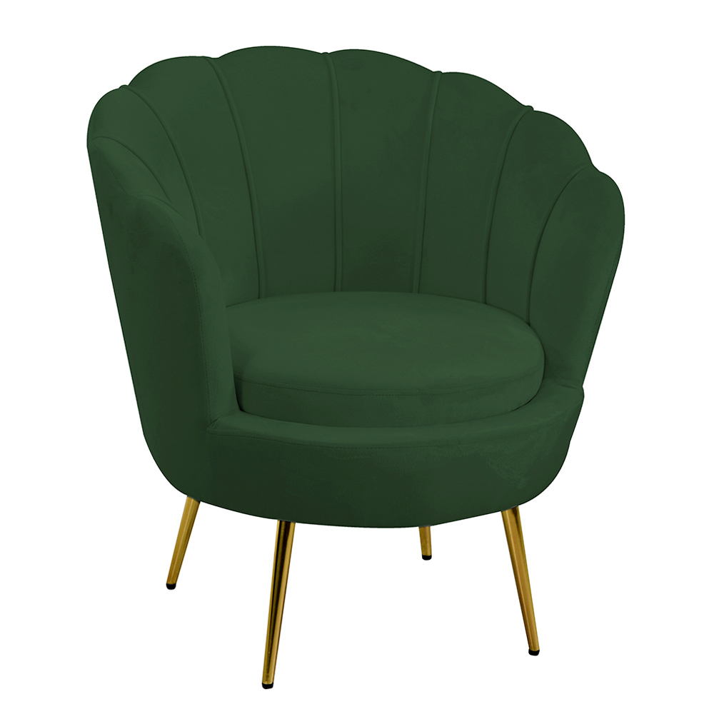 Med sit skalformede design kombinerer denne lænestol vintage-elegance og moderne stil. Det bløde og luksuriøse fløjl giver en følelse af forfinelse og omfavnende komfort, hvilket gør den perfekt til at berige en stue, et soveværelse eller et arbejdsværelse med et element af tidløs glamour.