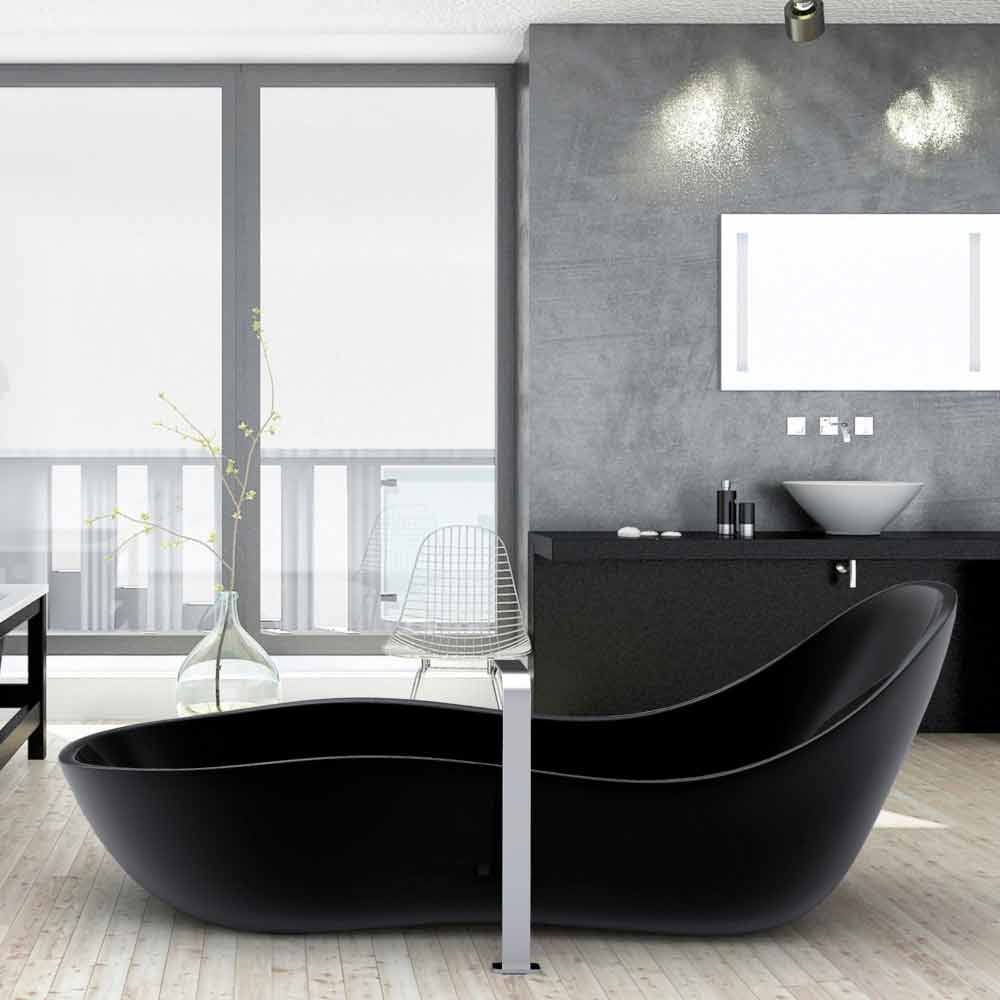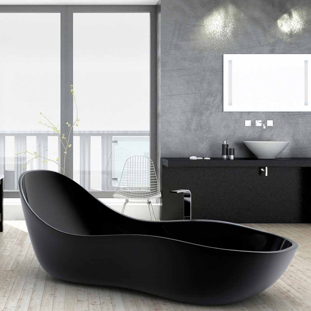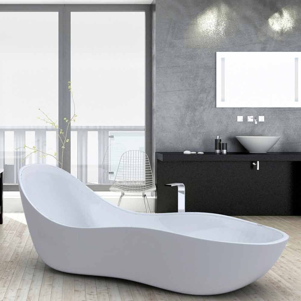 Fritstående Solid Surface badekar; med komfortable og bølgede former, fremhævet af en sideprofil, der minder om formen af en Wave, som den har fået sit navn fra. Ud over sin "smidige" profil har den et løft i bagenden, som bliver en reel støtte til ryggen. Den er meget ergonomisk, da den er afrundet i alle dens dele, og i den ikke høje del ser dens bøjninger ud til at ledsage bevægelserne ved opstigning og nedstigning fra den. Håndvask fås i to farvevarianter: Hvid (RAL9003) eller Sort (RAL9005)