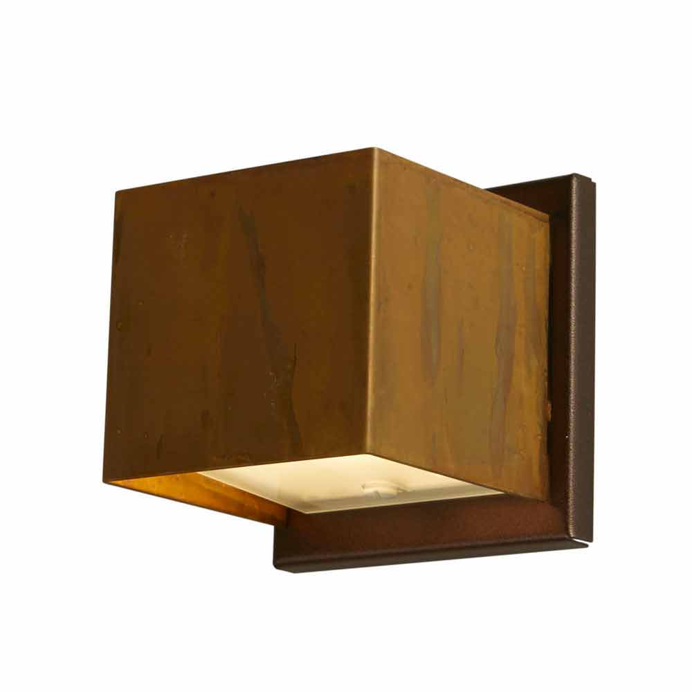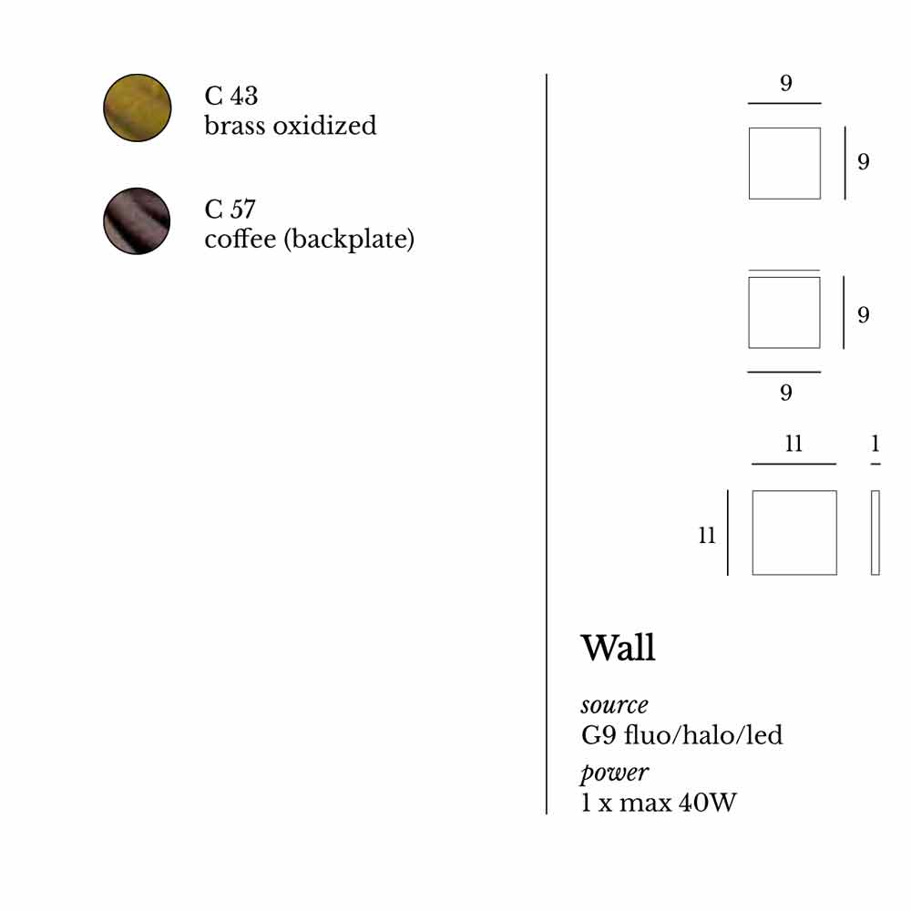 Væg lampe med messing struktur oxideret og bundsikringslag i pulverlakeret stål. Fås i to størrelser i firkantede eller runde form. Hærdet glas diffuser for en lysudsendelse direkte og indirekte.