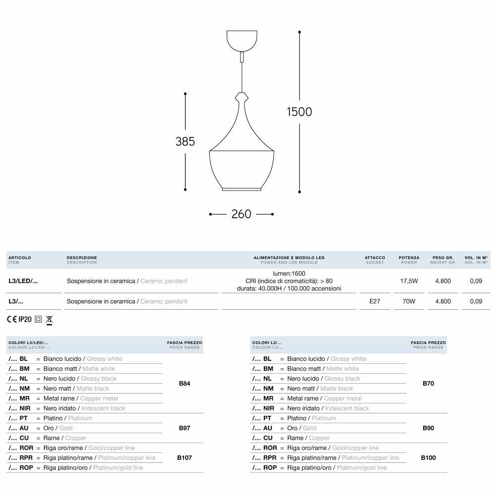 I Lustri 3 fås med forskellige overflader og med stikkontakt til standardpære E27 eller LED-lys.
