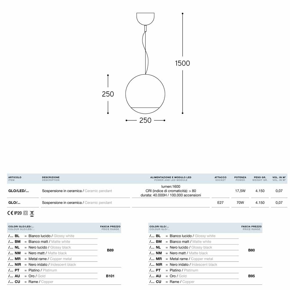 Designer keramisk pendellampe Globo fra Aldo Bernardi , fås med stikkontakt til standardpære E27 eller med LED.