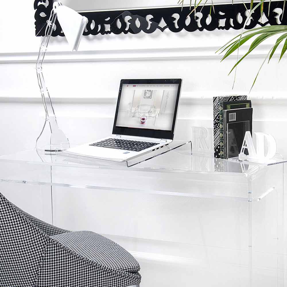 Lavet af gennemsigtigt eller røget plexiglas fra 100% jomfruelig polymer, det er den perfekte allierede til at arbejde hjemmefra i komfort og kan præsentere sig som en original idé til julegaver til dem, der ønsker et praktisk og funktionelt designkomplement . Materialet, resistent og af høj kvalitet, garanterer en konstant lysstyrke og glans over tid.