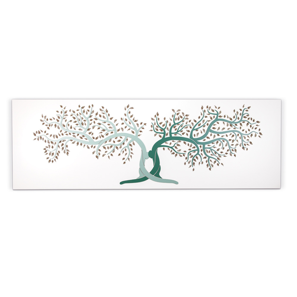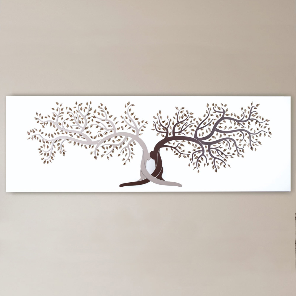 Dekorativt panel , der repræsenterer foreningen af to stammer med en omfavnelse, symbol på livet. Grene og blade lavet med lasermarkering forgrener sig fra stammen. Mat hvidlakeret træplade med applikationer i lakeret træ i to nuancer af grus og kakao eller i dens grønne variant og lasermarkering.
