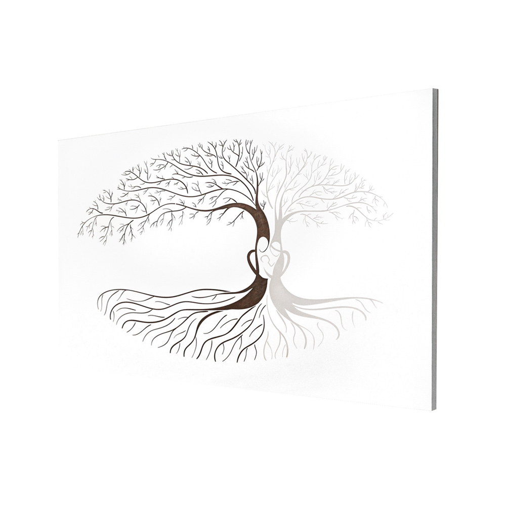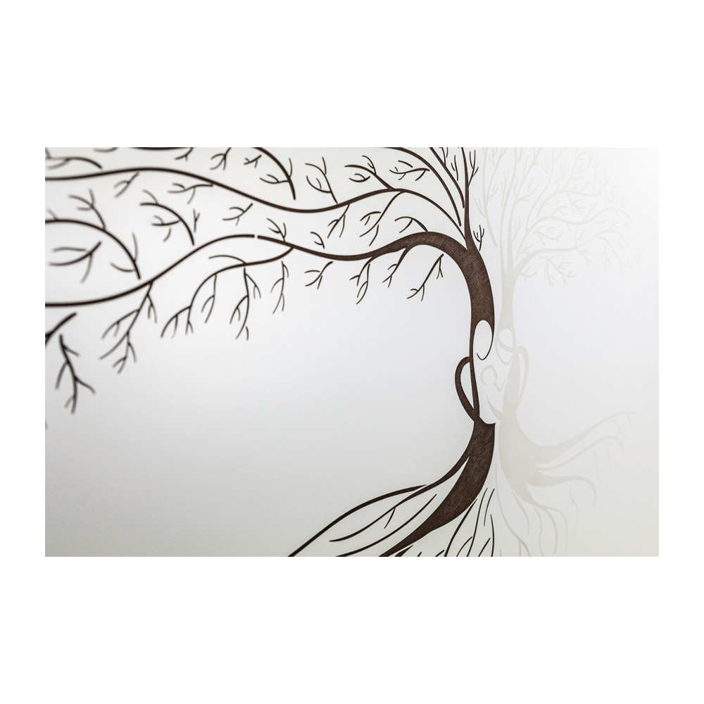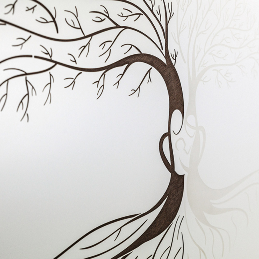 Grene og blade lavet med lasermarkering forgrener sig fra stammen. Stel i mat hvidlakeret træ med applikationer i lakeret træ i to nuancer og lasermarkering.