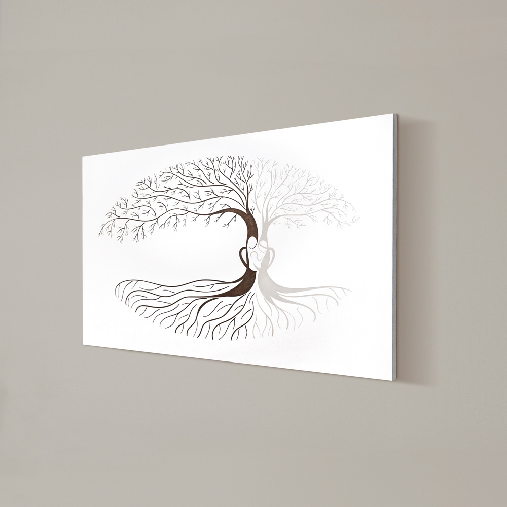 Dekorationspanel, der repræsenterer foreningen af to stammer i en familiefavnelse, et symbol på livet.