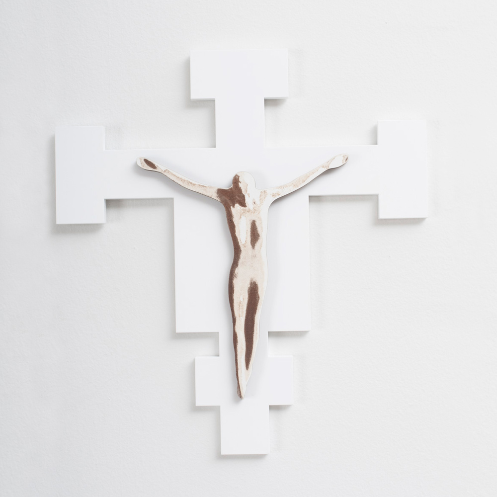 Hvidlakeret trækrucifiks med lasergraveret hvidlakeret træ Christ -applikation, der fremhæver kroppens detaljer.