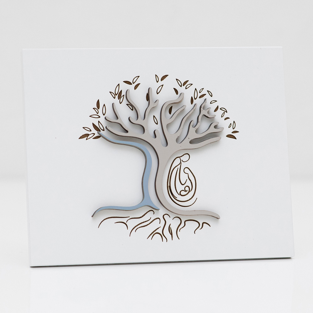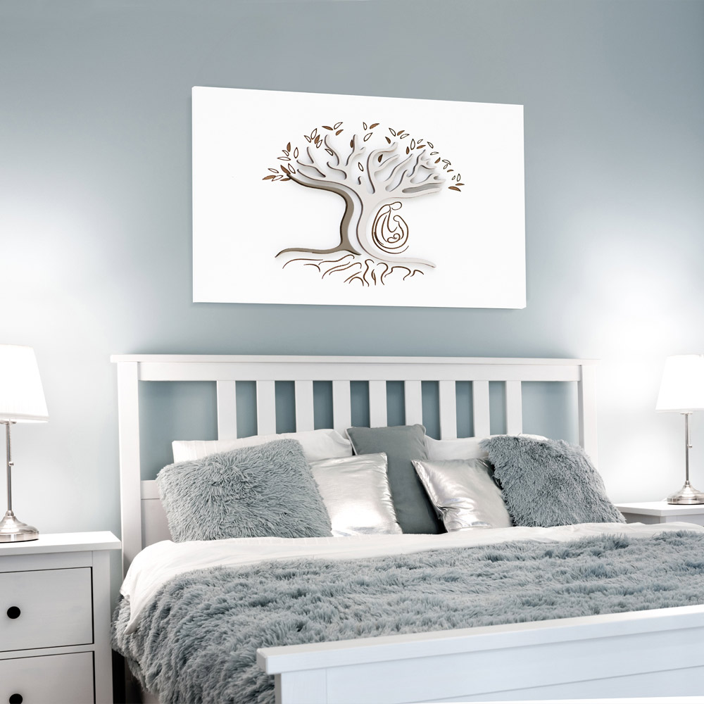 Dekorationspanel, der repræsenterer livets træ med familien takket være den dygtige kombination af lasermarkering og skæring. Stel i mat hvidlakeret træ med anvendelser i lakeret træ i forskellige nuancer .