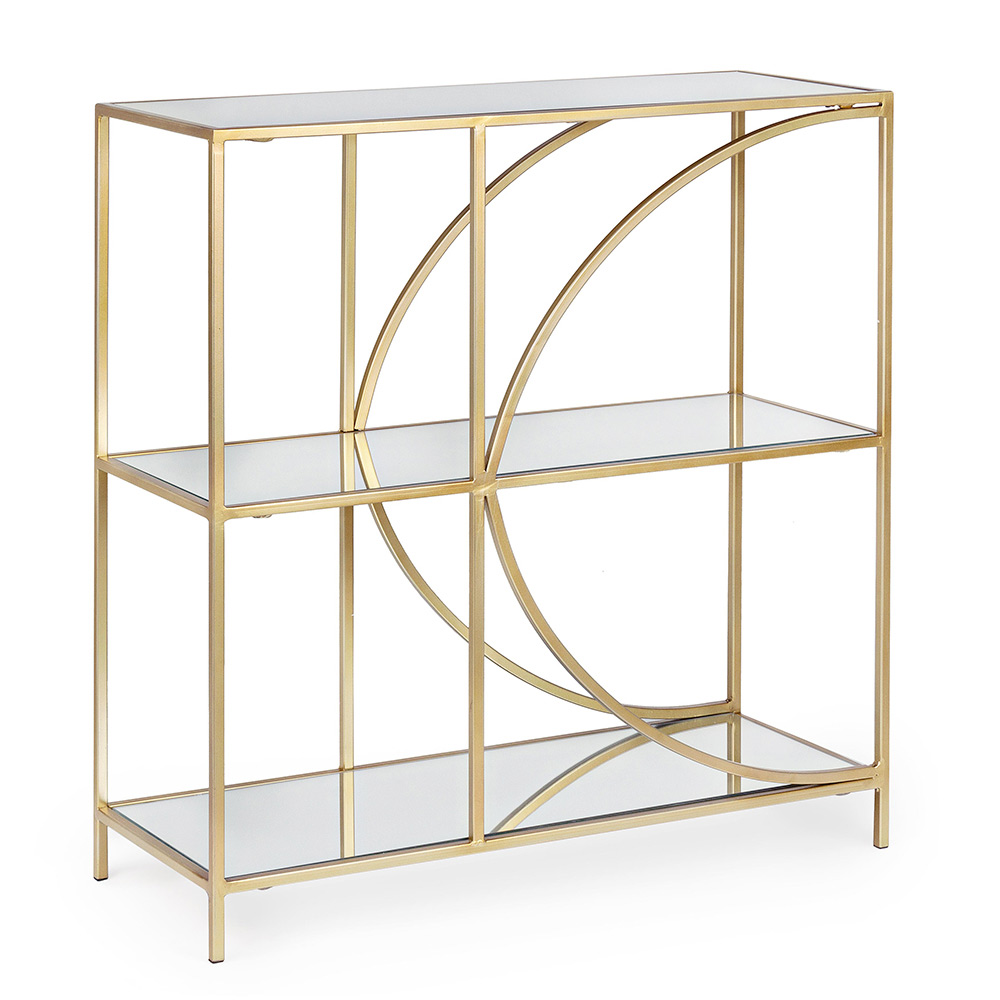 Denne fritstående reol har en lav epoxy pulverlakeret stålramme og glashylder .