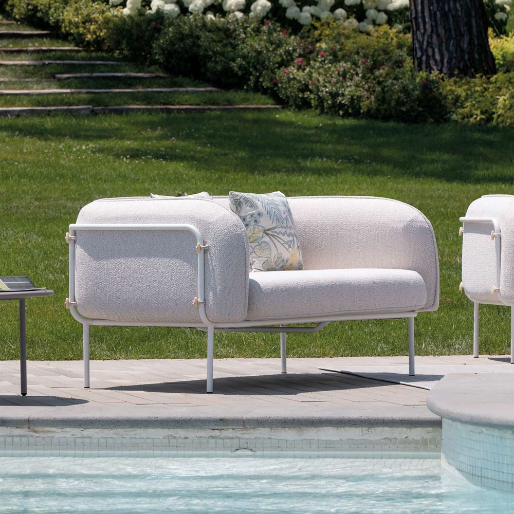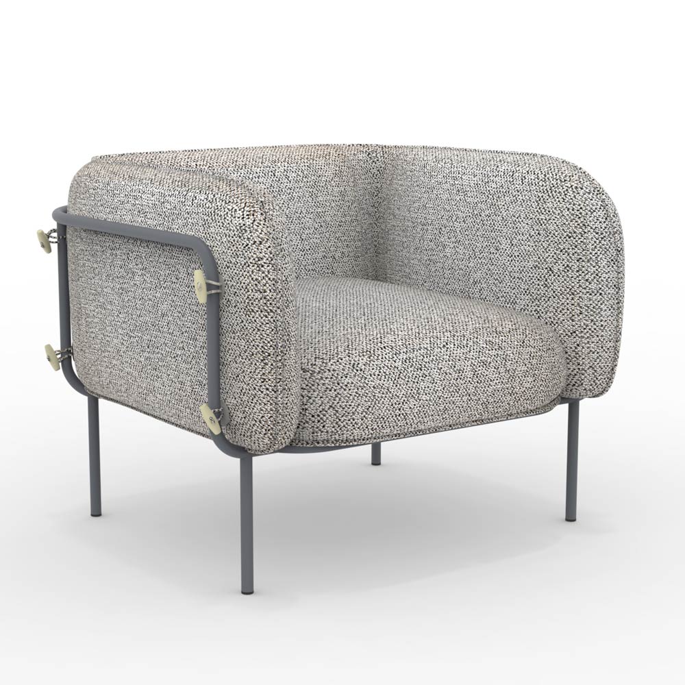 Lav havelænestol med pulverlakeret galvaniseret jernstruktur og stofsæde. Fremstillet i Italien.