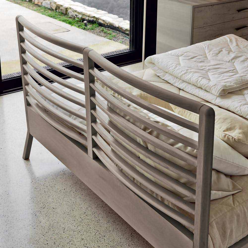 I denne løsning tilbyder den mest harmoniske seng en polstret hovedplade, udsmykket med sømme, der sporer lodrette linjer. Væsentlig og elegant, den er lavet af solid valnød færdig i olie, der skal indsættes i de mest raffinerede møbleringskontekster.