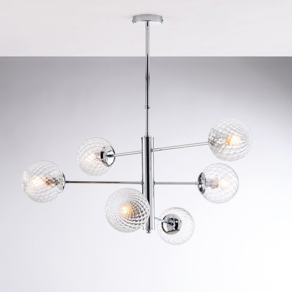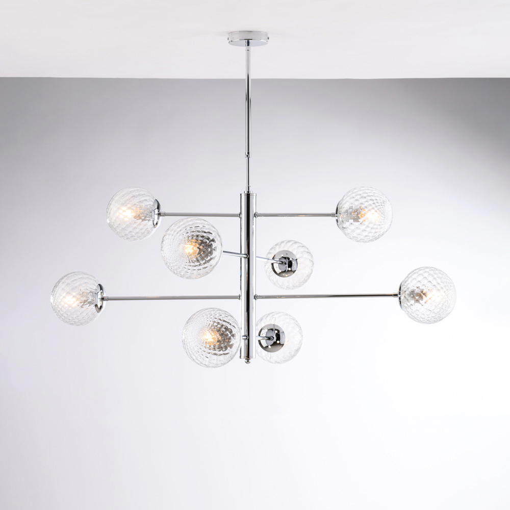 Denne pendellampe fås i poleret krom eller bronze og passer naturligt ind i moderne stuer , spisestuer , åbne rum , designermiljøer og kontorområder . Kombinationen af metal og glas udtrykker det fremragende håndværk fra Made in Italy med særlig opmærksomhed på detaljer og proportioner.