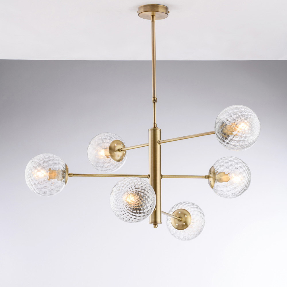 Denne håndlavede pendellampe i jern er elegant og moderne og skiller sig ud med sin afbalancerede, geometriske komposition. De vandrette arme understøtter sfæriske glasdiffusorer, hvilket skaber et raffineret samspil af symmetrier, der kaster et diffust, harmonisk lys.