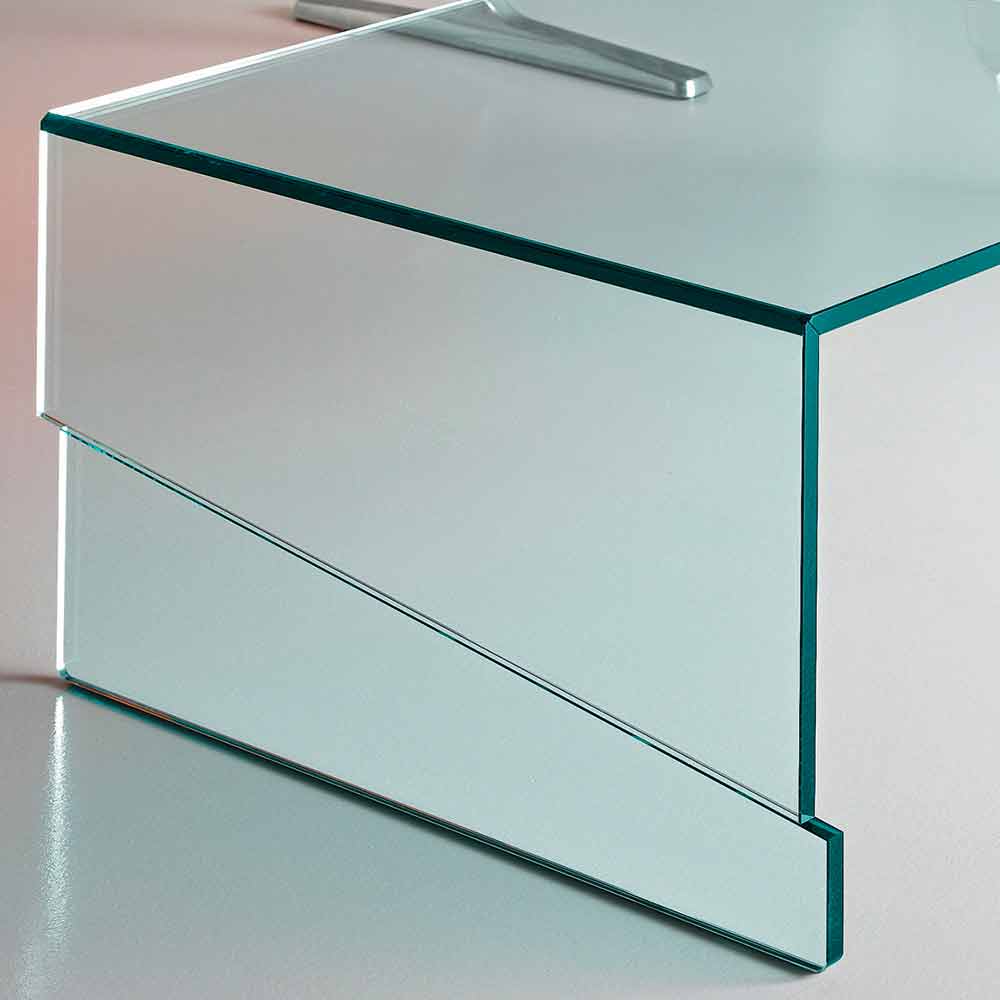 Helt fremstillet af gennemsigtigt glas , er det kendetegnet ved den udkragede, skårne og svejste side og støtteflader fremstillet ved hjælp af en teknologi, der er placeret til tjeneste for designet.