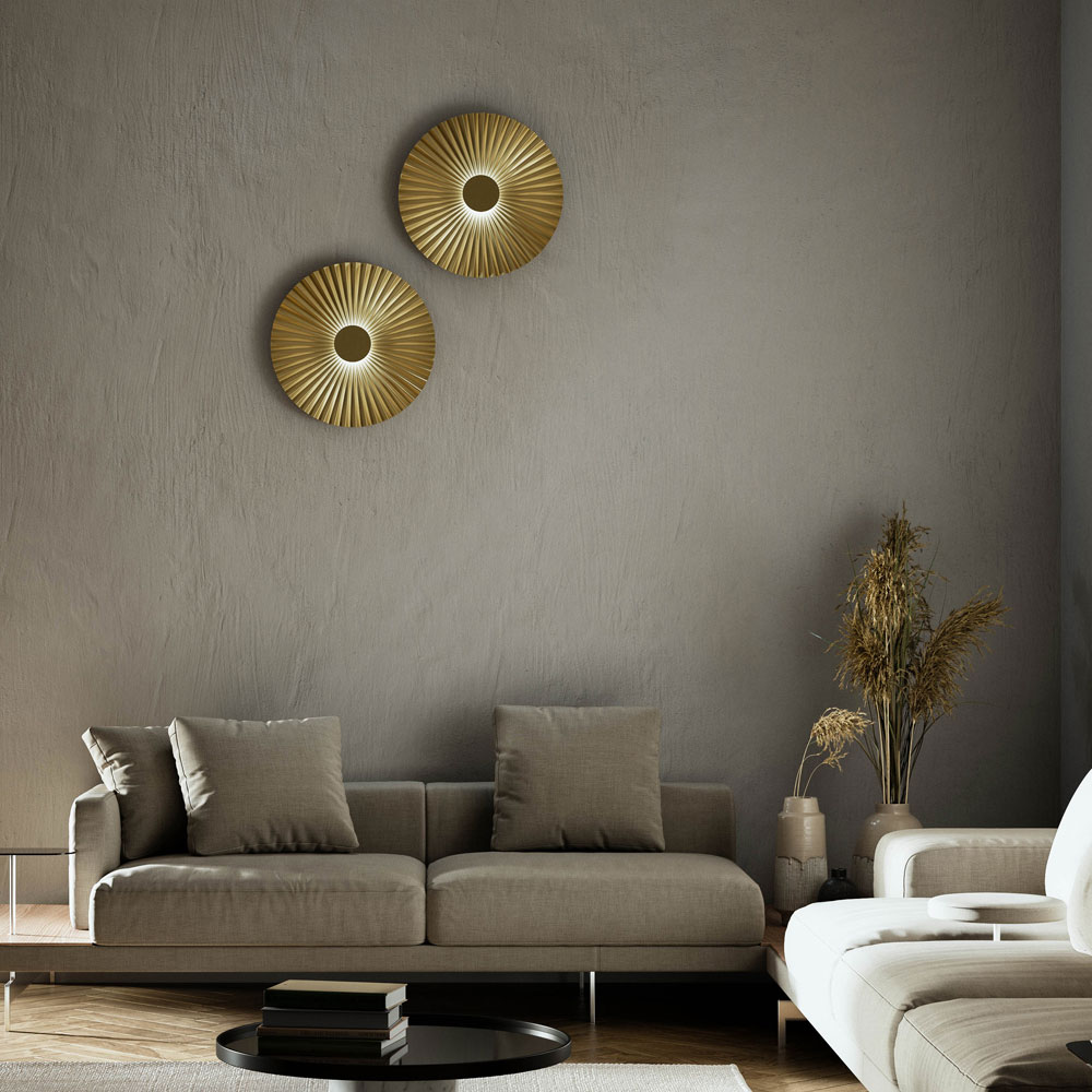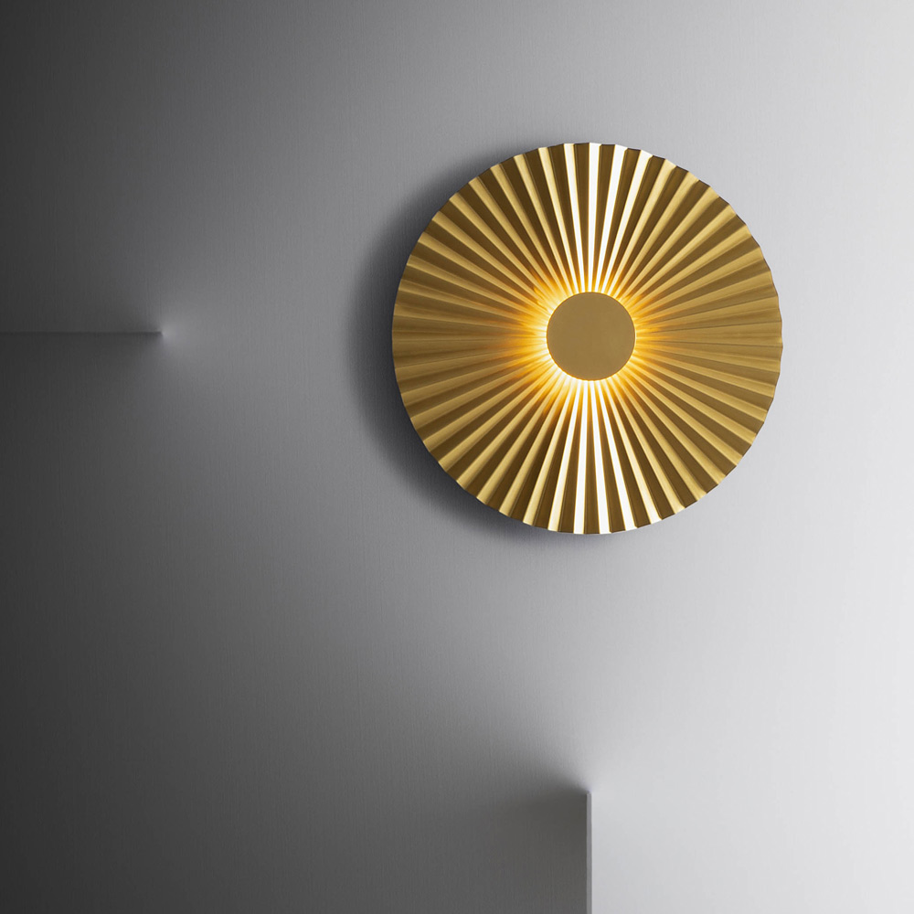 Væglampe i plisseret poleret natur messing, 2 størrelser fremstillet i Italien.