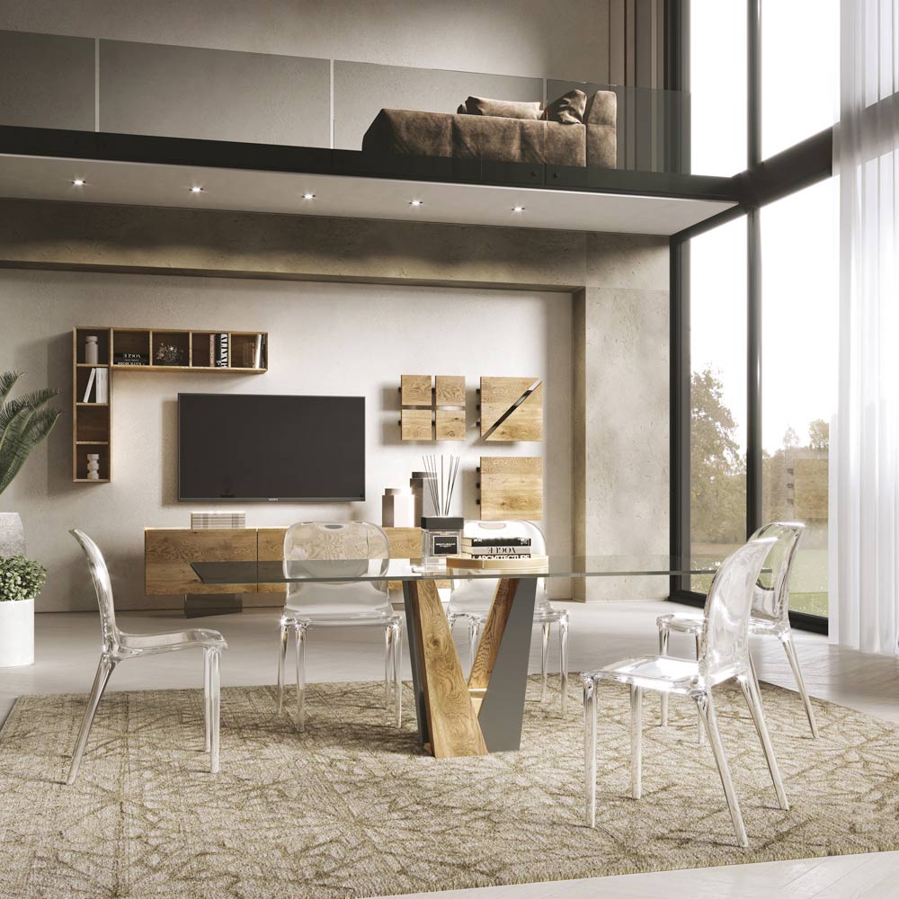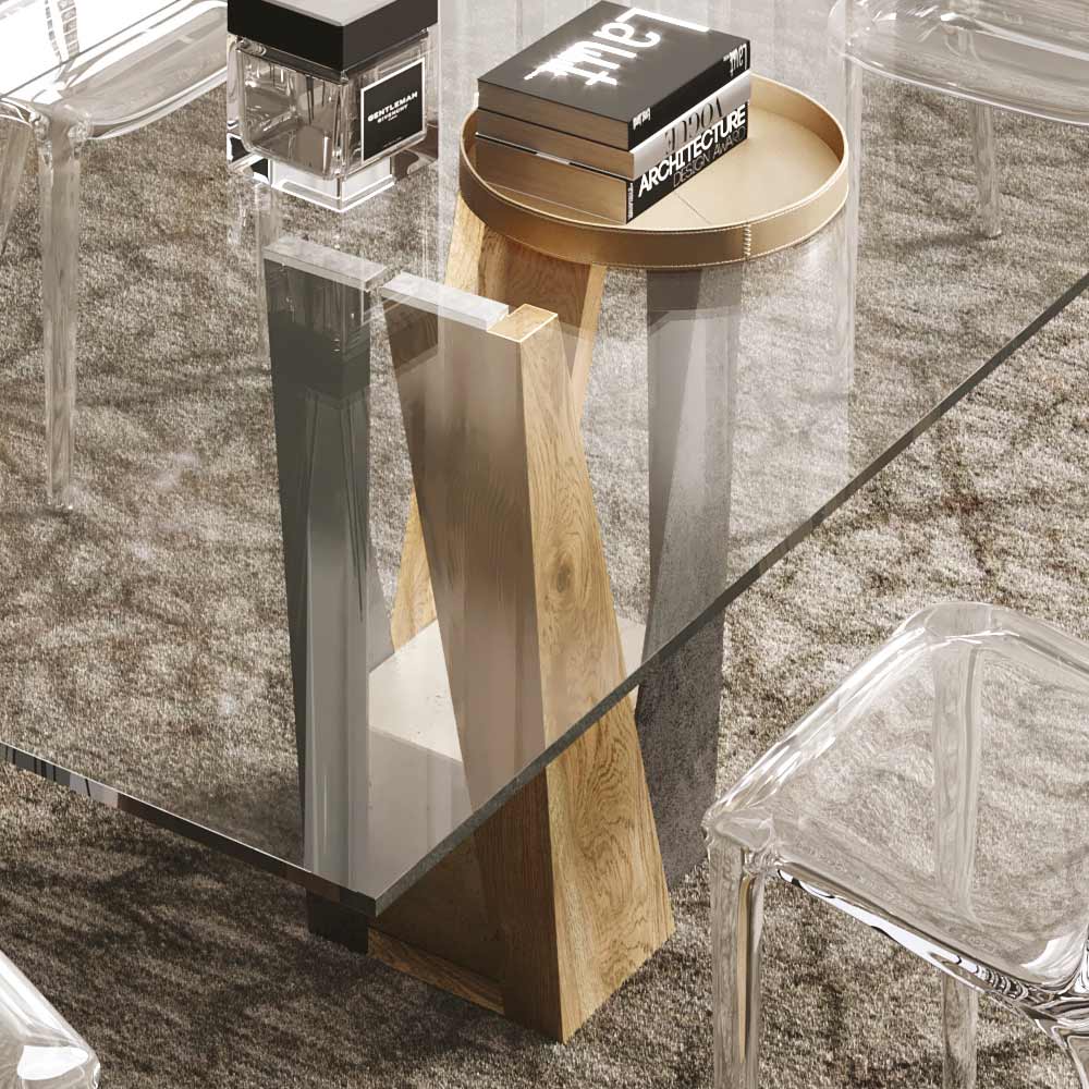 elementer i jerngrå metal og knudret eg forankret til en travertinblok i midten af basen. Produktet er