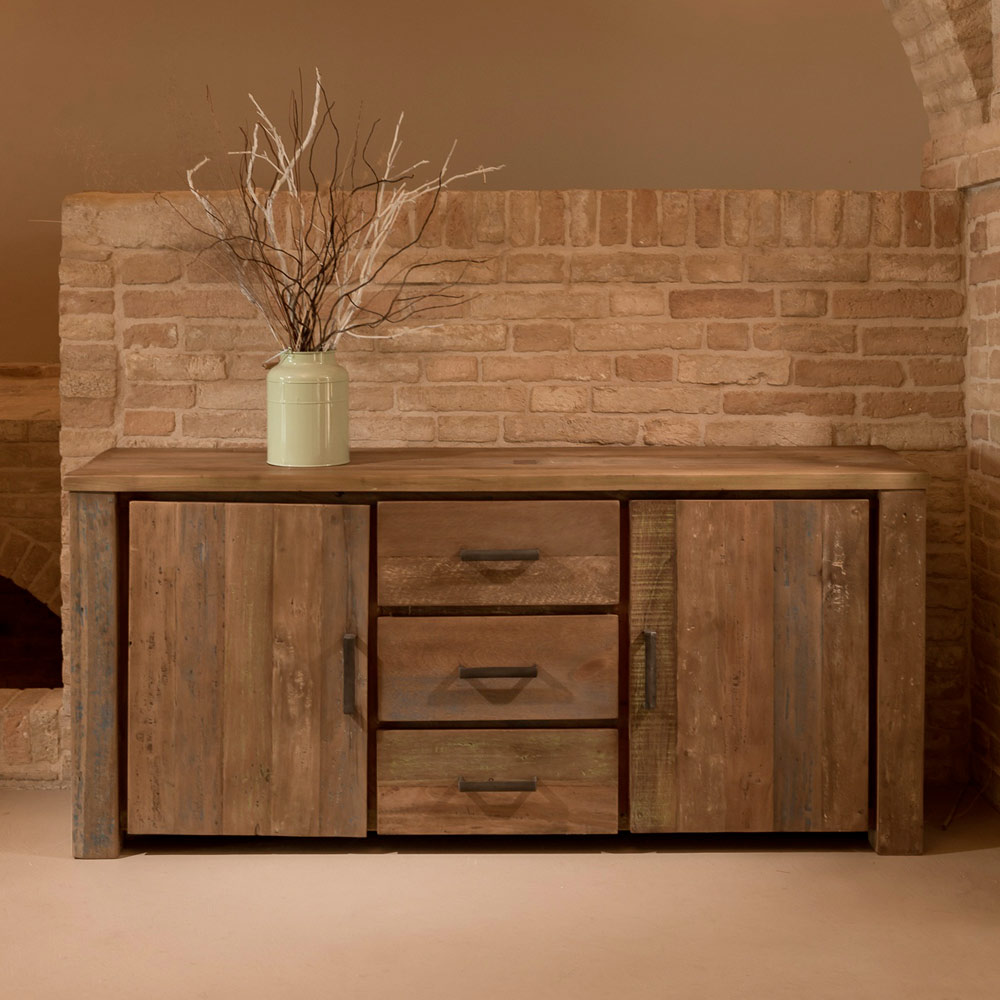 Indendørs skænk lavet af genbrugstræ med Pandora finish med 2 låger og 3 midterskuffer .
