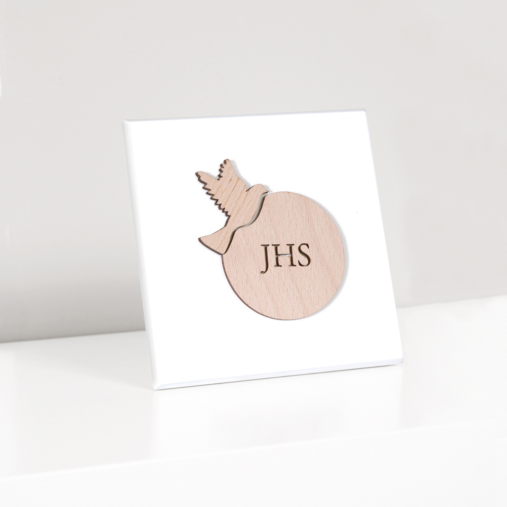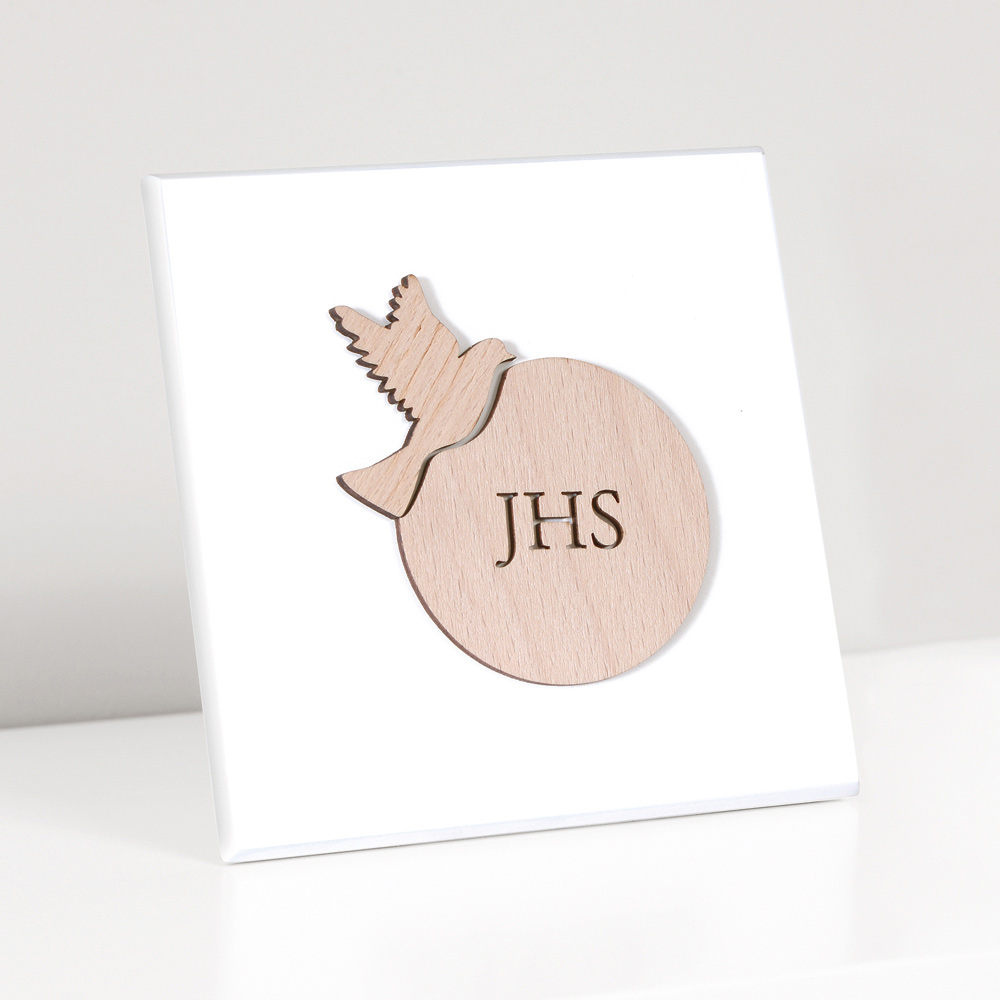 Helligt billede med vært og konfirmationsdue i naturligt træ påført. Hvidlakeret træpanel med støttefod og hul til at hænge den på væggen.