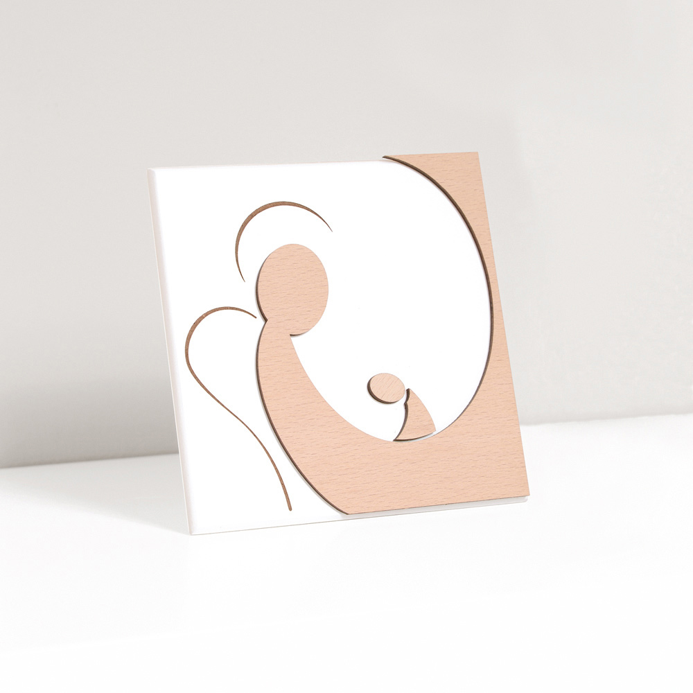 Helligt billede med mor og barn i naturligt træ påført. Hvidlakeret træpanel med støttefod og hul til at hænge den på væggen.